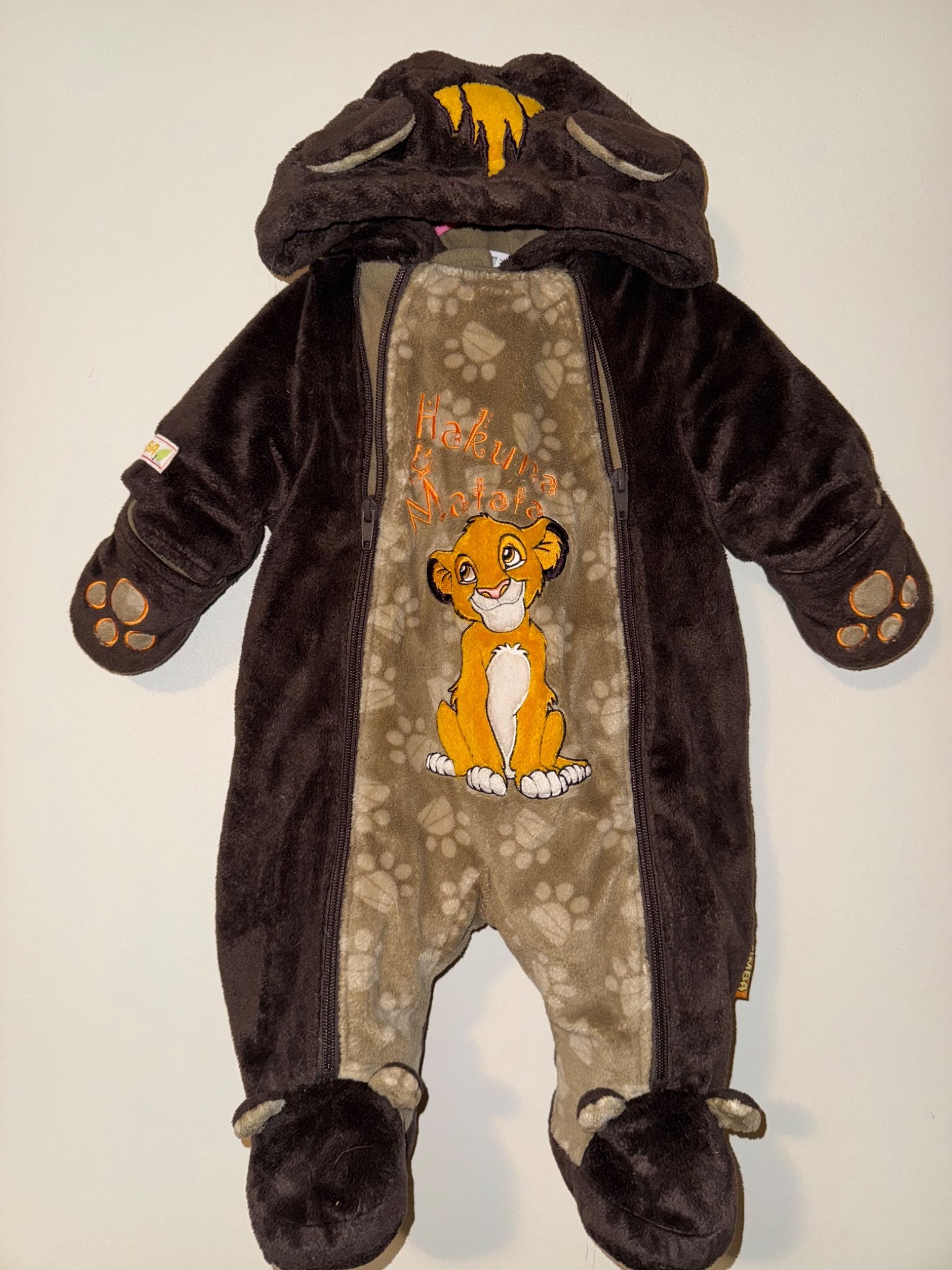 Description : Lion King bunting suit. Very warm & cozy for all those winter babies! EUC, fits pretty big with lots of room to grow. 0-3M