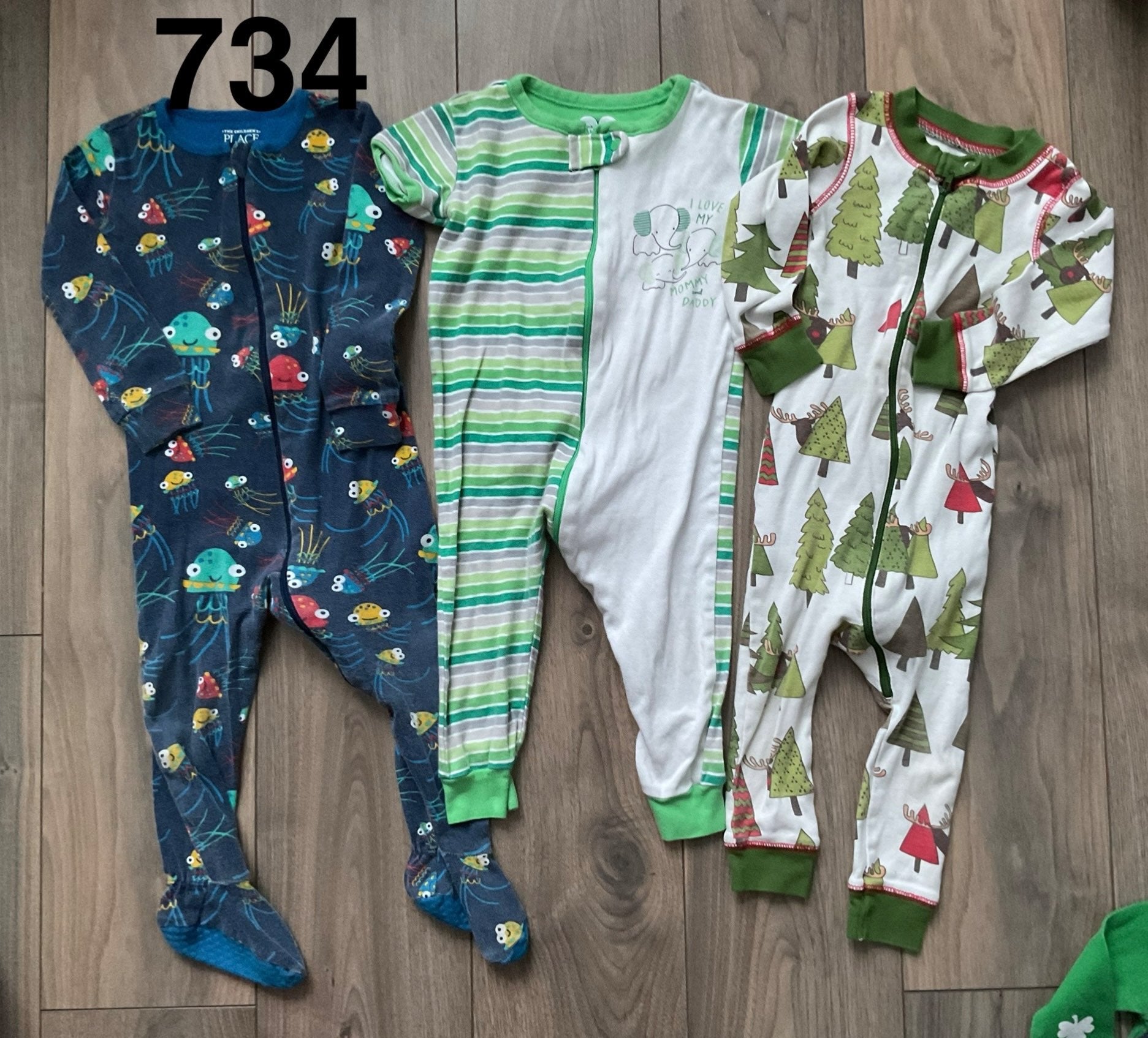 Description : Blue fitted zipper sleeper and green footless, short sleeve sleeper are both 12-18 months, Children’s Place, Moose sleeper is fitted with no feet, 12 months, Lazy One Plaid shorts with elastic waist, Joe Fresh 6-12 months Nay blue jersey shorts are George 12 months Grey fleece pants with elastic waist are George 6-12 months Red knit pants have elastic waist, Joe Fresh 6-12 months