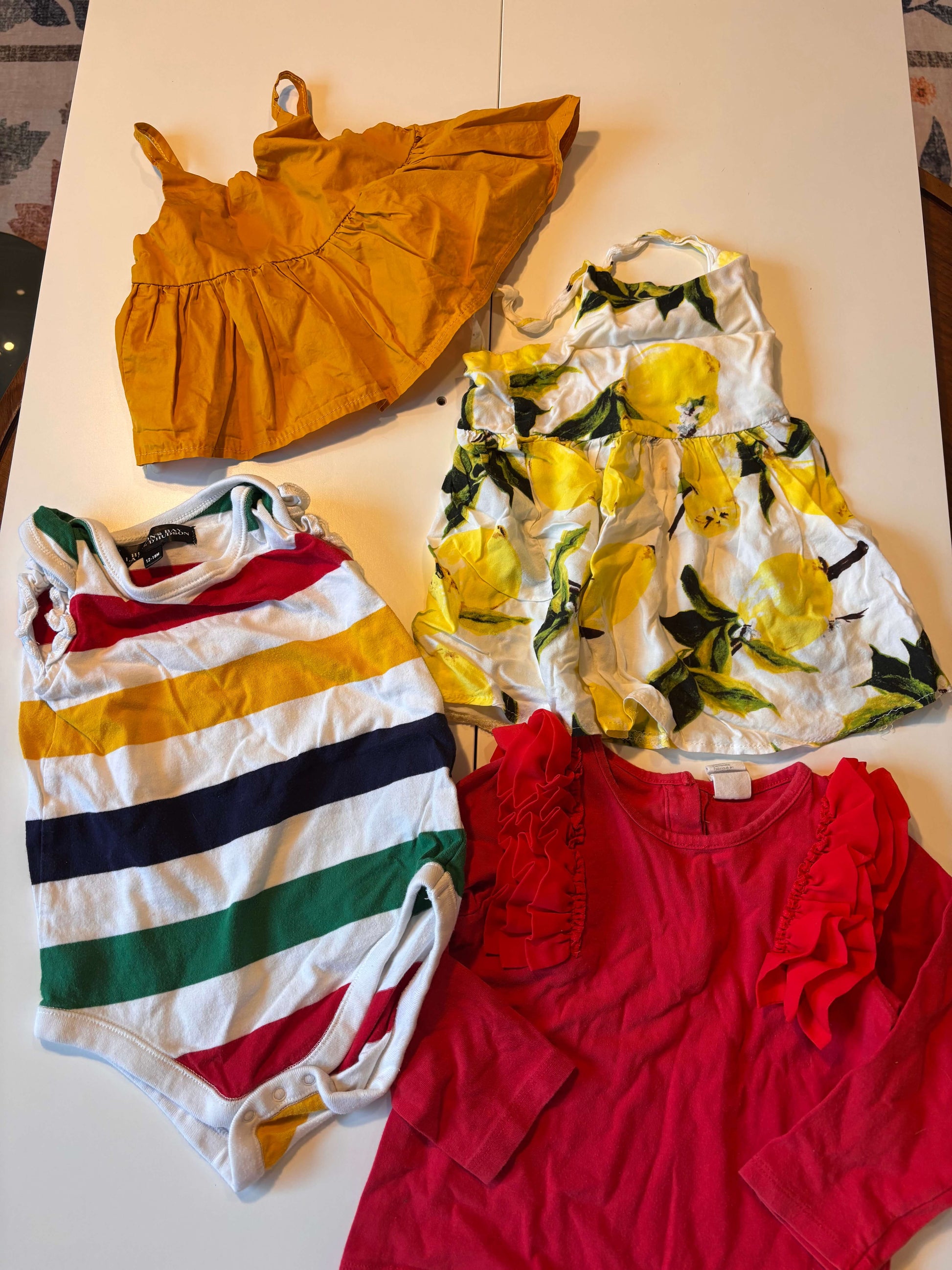 Description : 12-18m clothing bundle 2 tops, 1 onesie, 1 dress top- 12-18m no tag. soooo cute top- H&M 12-18m dress- 12-18m i dont know where its from onesie- the bay 12-18m