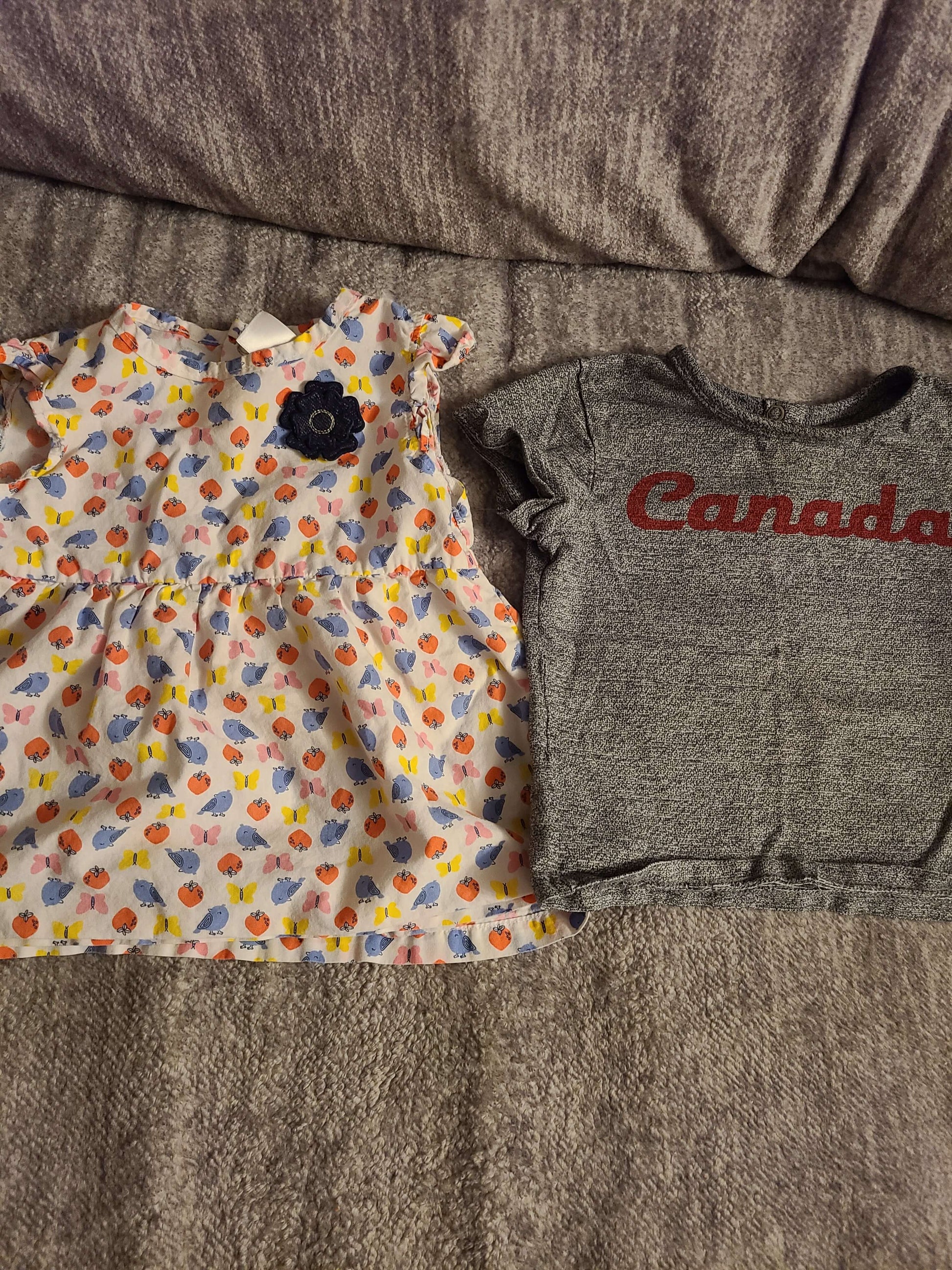 Description : 12 to 18 month girls t shirts 4 pcs.. one pink with strips, one pink with roots and rainbow, one white with birds and fruit and one Grey with canada