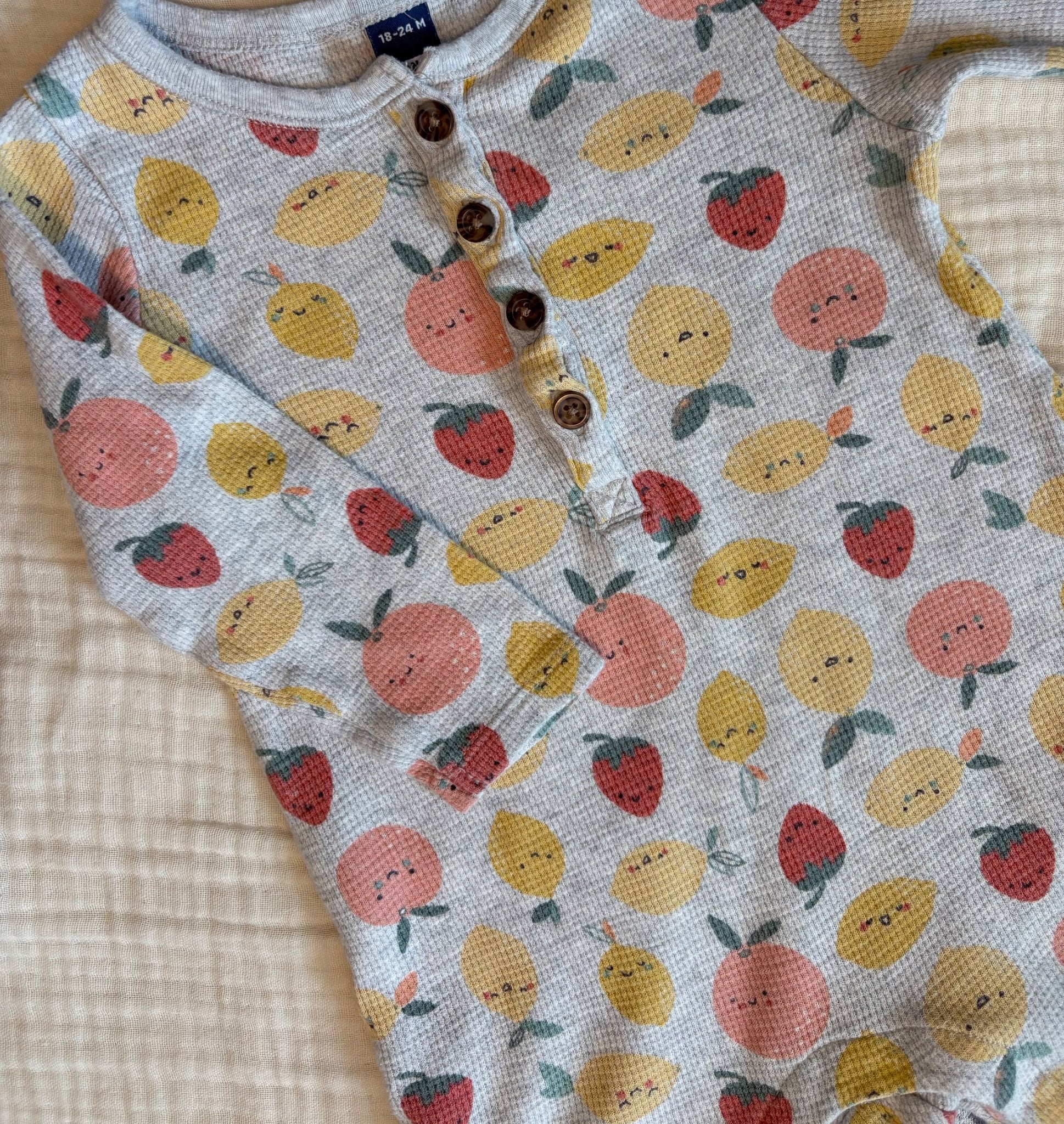 x1 Old Navy long sleeved footless button up outfit with adorable smiling fruits pattern