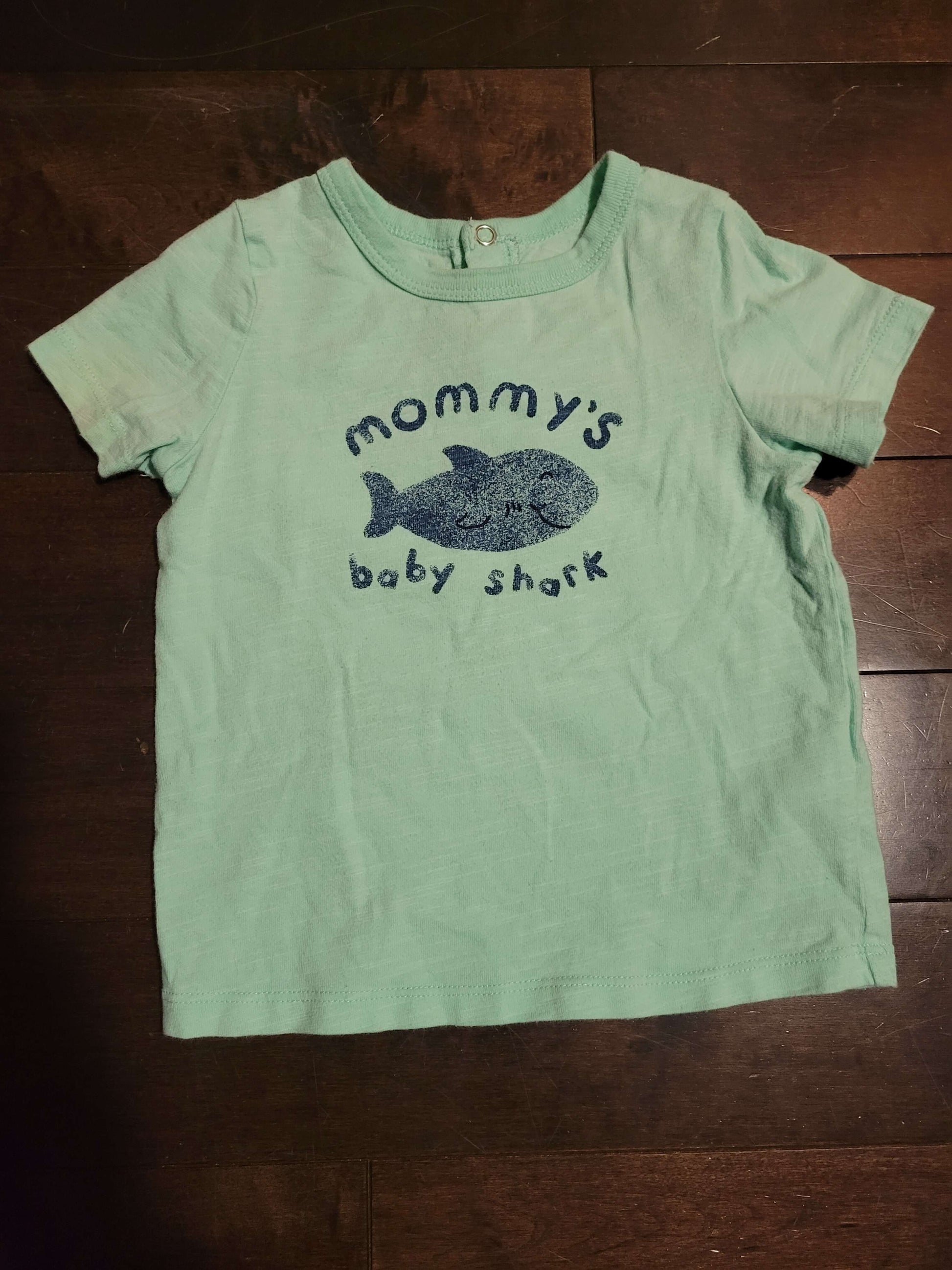 Description : 3 TShirts, all 18-24M all have some wash wear but not rips, stains or holes. Blue stripe shirt is Old Navy, shark shirt is Joe Fresh and dino shirt is George Shark shirt have snaps on the back.