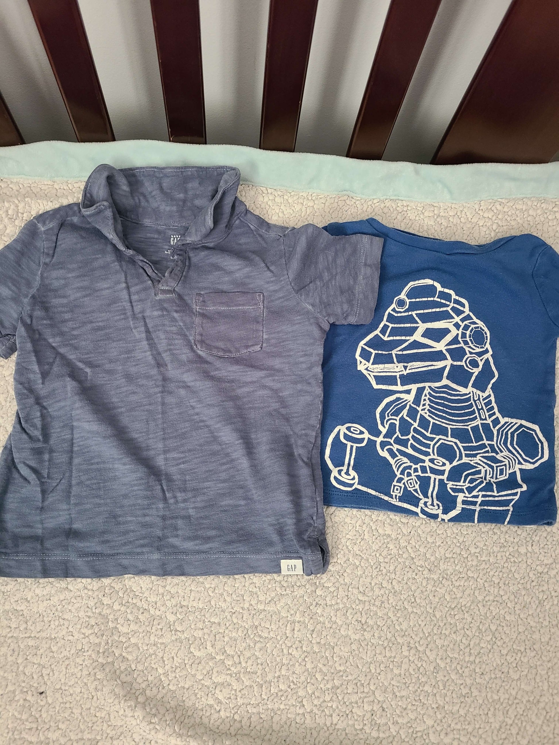 Description : 18 month t shirts.. one is a collared blue shirt, one is blue with a dinosaur, one is Grey like a boss and the last one is orange with cars saying in it to win