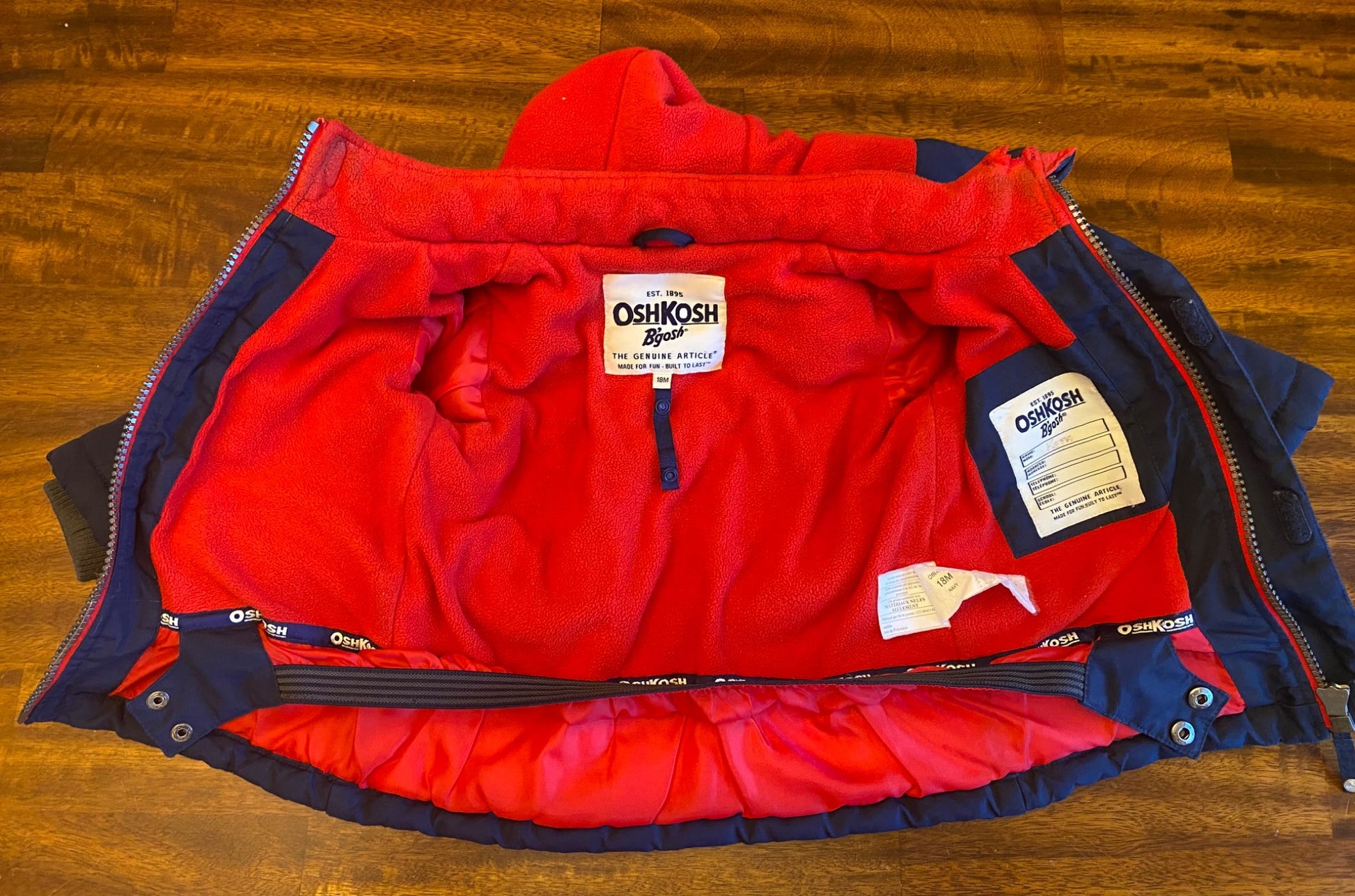 Description : 18mth OshKosh snow winter jacket, worn 2 seasons, repaired small hole in top inside corner near zipper which is not visible when zippers done up and doesn’t impact jacket function at all (see close up pics) Made for active kids, this jacket features a cozy polar fleece lining at the top and smooth taffeta lining at the bottom for ultimate warmth and flexibility. It’s packed with practical details, including a front zipper closure with a chinguard, zippered hand and chest pockets for essentials, and an adjustable, detachable faux-fur hood for added protection. The inner rib cuffs keep the cold out, and the inside name label ensures it’s easy to identify. Ready for every winter adventure, big or small! Style # V_OBTJ097A Features: Front zipper closure with chinguard Front storm panel with velcro closure Front zippered hand pockets Zippered chest pocket Inner rib cuffs Top polar lining, bottom section taffeta lining Detachable hood with faux-fur Inside pocket Inside name label