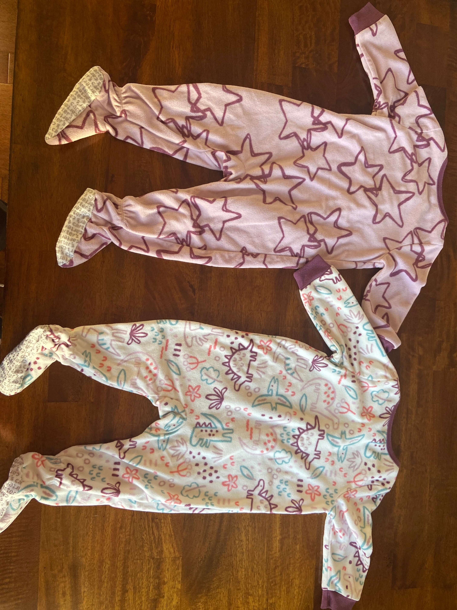 Description : Cozy and warm fleece sleepers to keep baby warm in the winter. Perfect for a baby born around Mar-May. Purple with Stars, white with purple dinosaurs. In excellent condition, no stains, tears or damage.