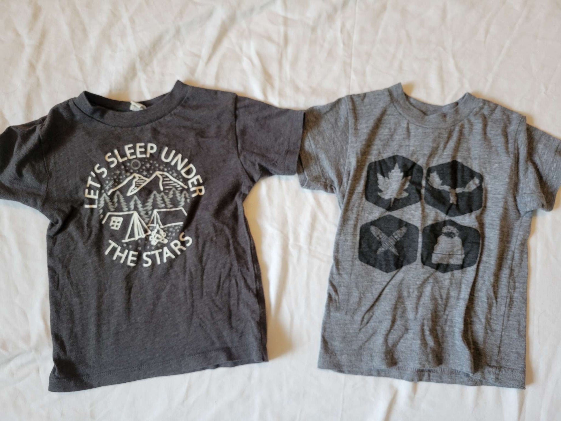 2 Gray Tshirts (Small Shop) - "Let's Sleep Under the Stars" and Canadian Moose/Leaf/Toque - Size 2T , Kids 2T