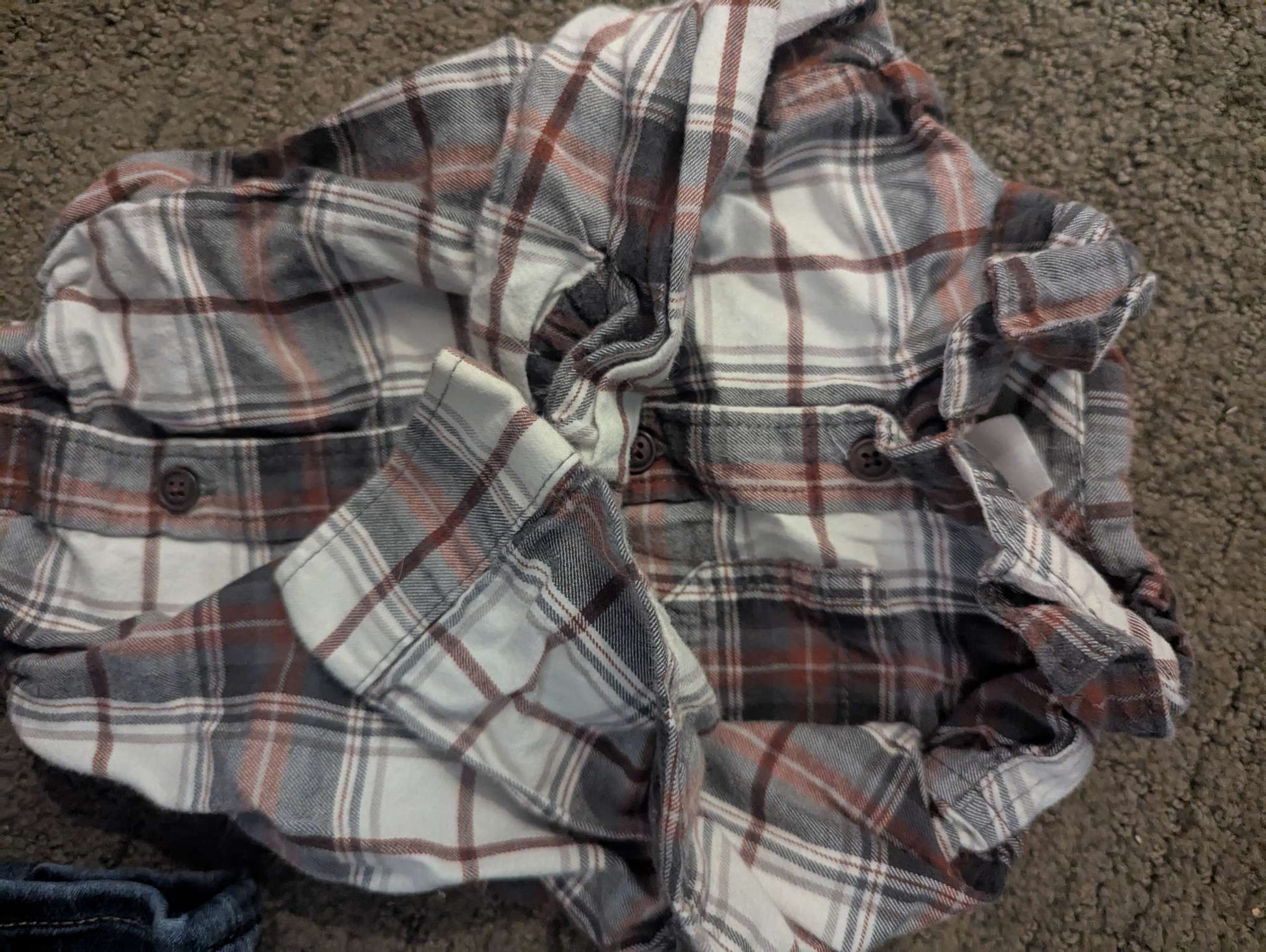 Description : Baby Gap jeans sized 3-6 months with functioning pockets. Found these fit bigger. Carters plaid Button up onesie shirt, sized 6 months. Very good condition. No stains or rips.