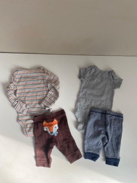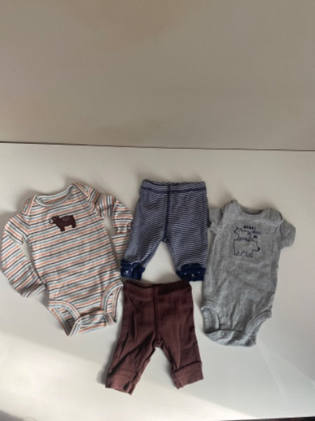 Description : Long sleeve onesie with snaps at bottom for east diaper change as well as removable mitts for hands. Other short also has snaps at bottom. Both pants are pull on