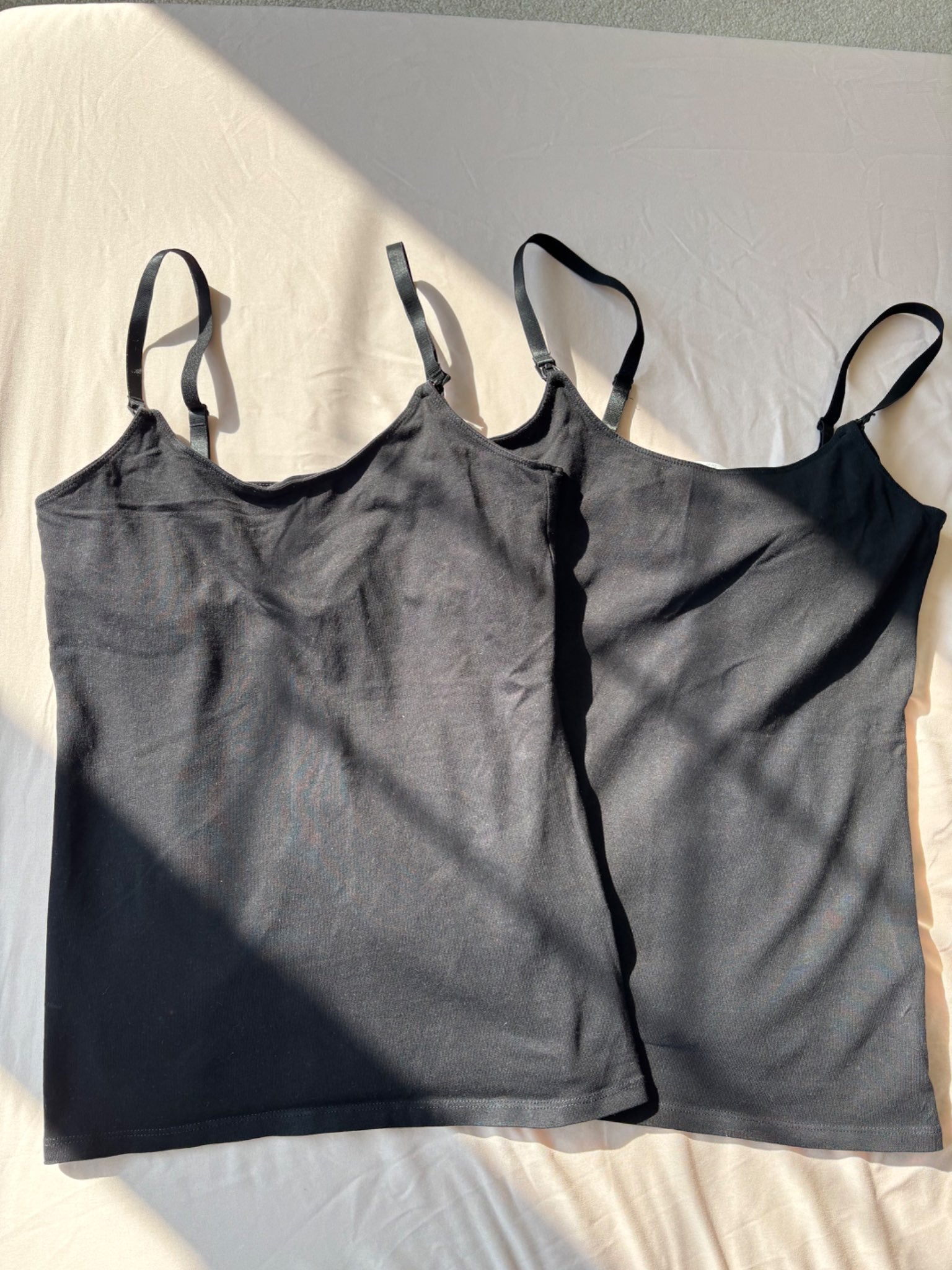 Description : 2 black H&M nursing tank tops. Adjustable shoulder straps with convenient fastening for easy nursing access. 95% cotton.