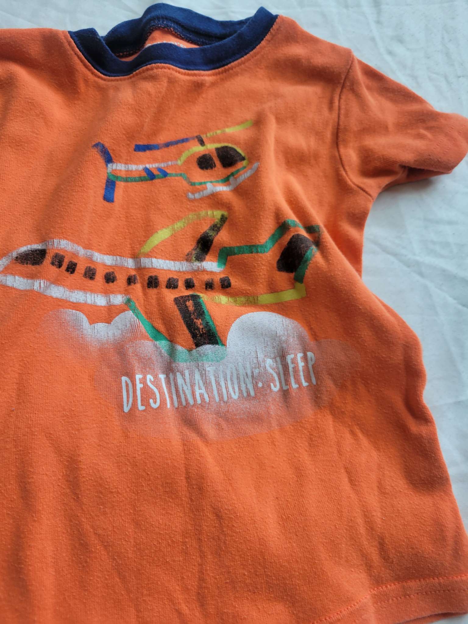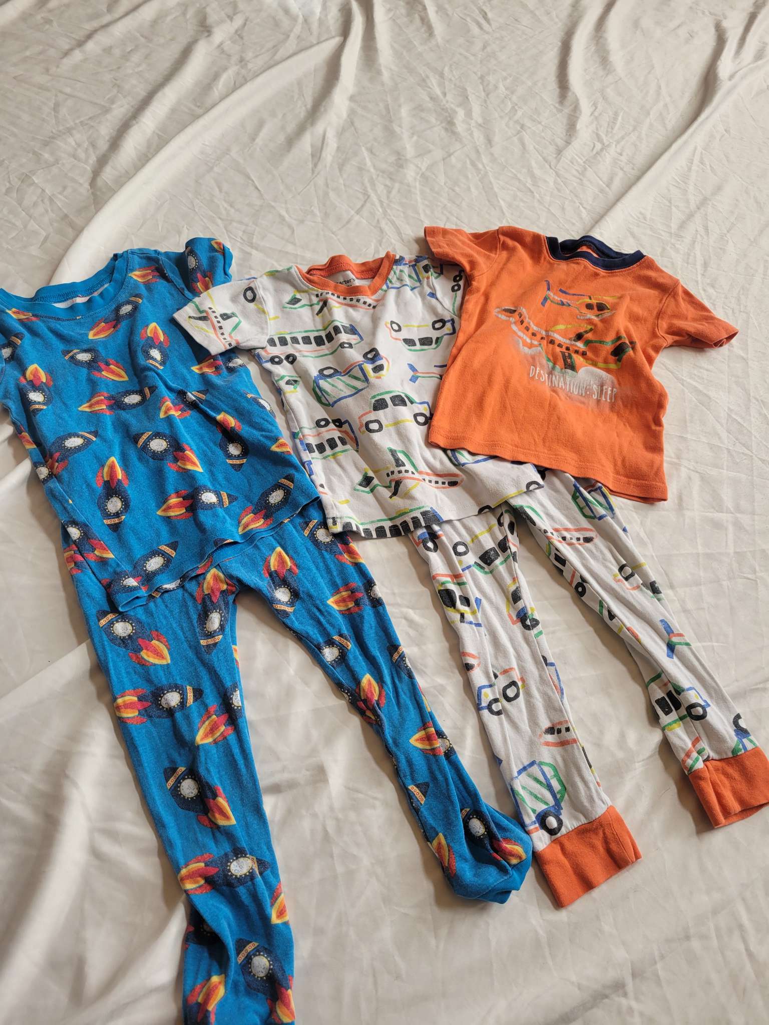 Description : 2 Sets of Pjs Blue short sleeve rocket ships ( Old Navy 4) White Transportation and additional orange shirt (Carters 4T)