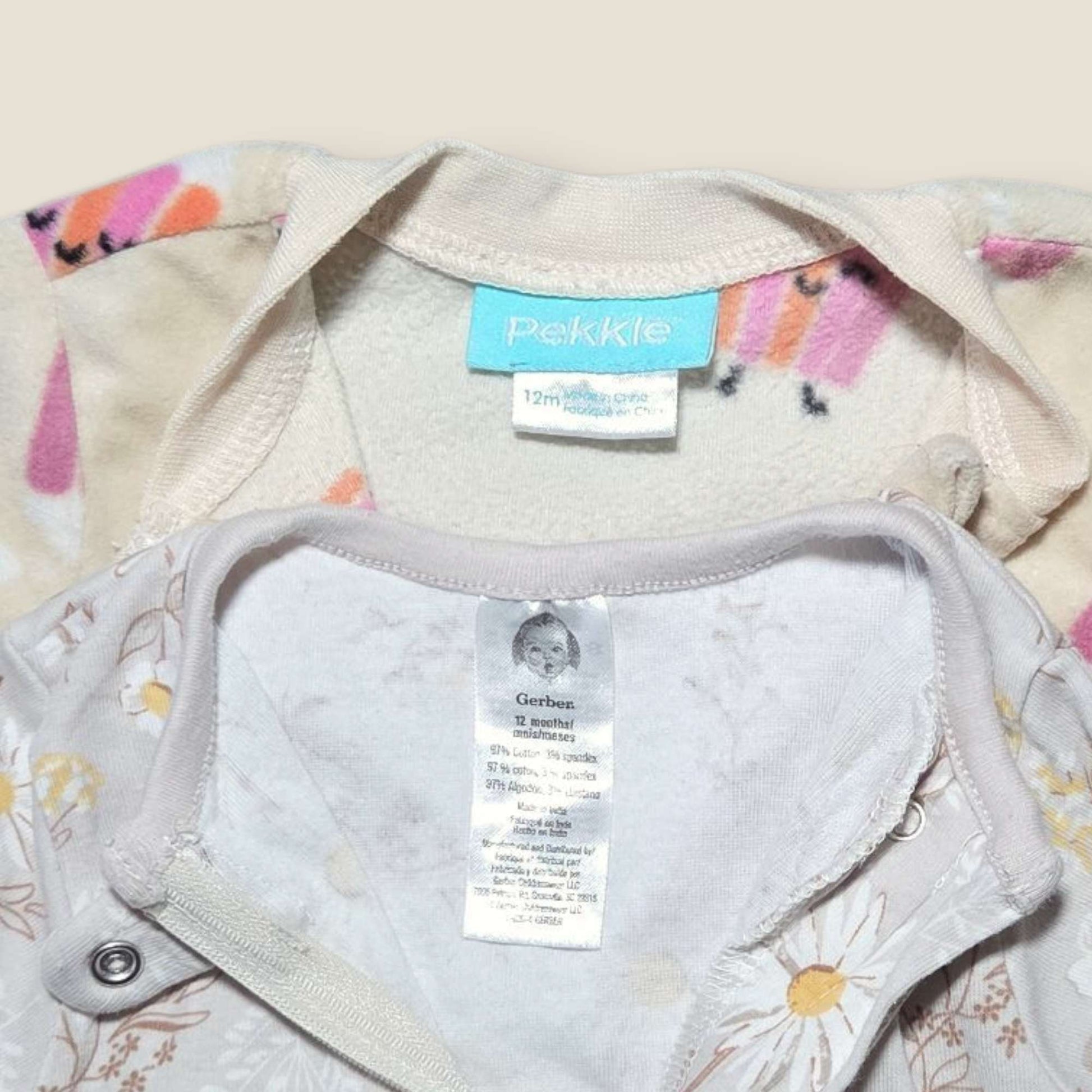 Description : 2 sleepers Pekkle popcorn & Gerbers floral patterned sz 12m.