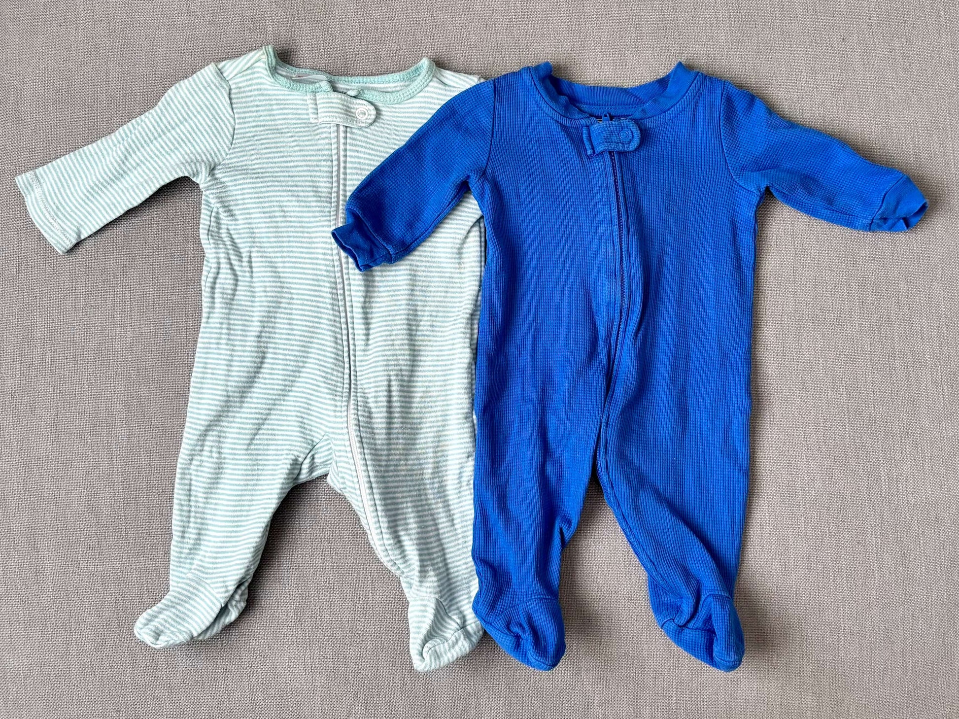 Description : Green and white stripe zip up sleeper, Simple Joys by Carters. Blue waffle zip up sleeper, Lamaze. Both 0 - 3 months.