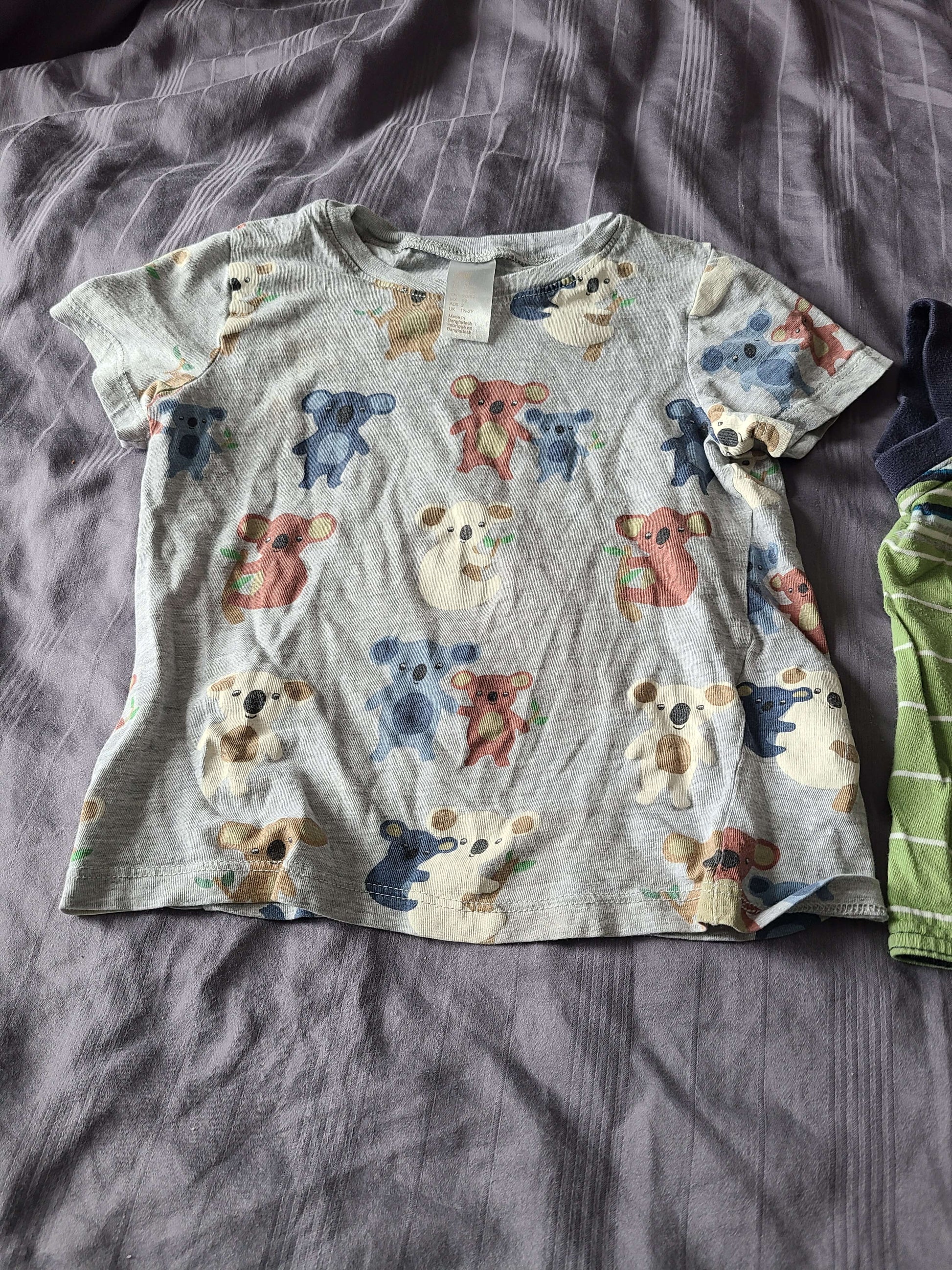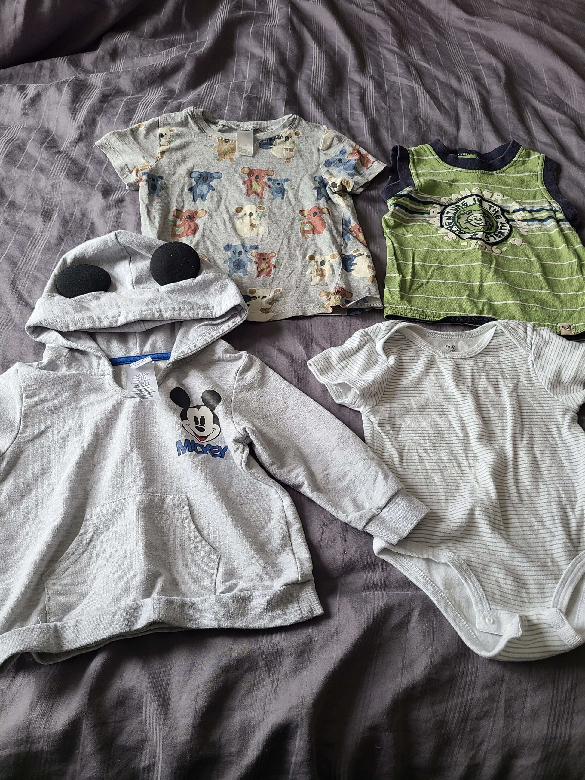 Description : 24 month tops.. one Grey mickey mouse hoodie, one Grey with koalas, one green stripped with lion and one onsie that is white with strips