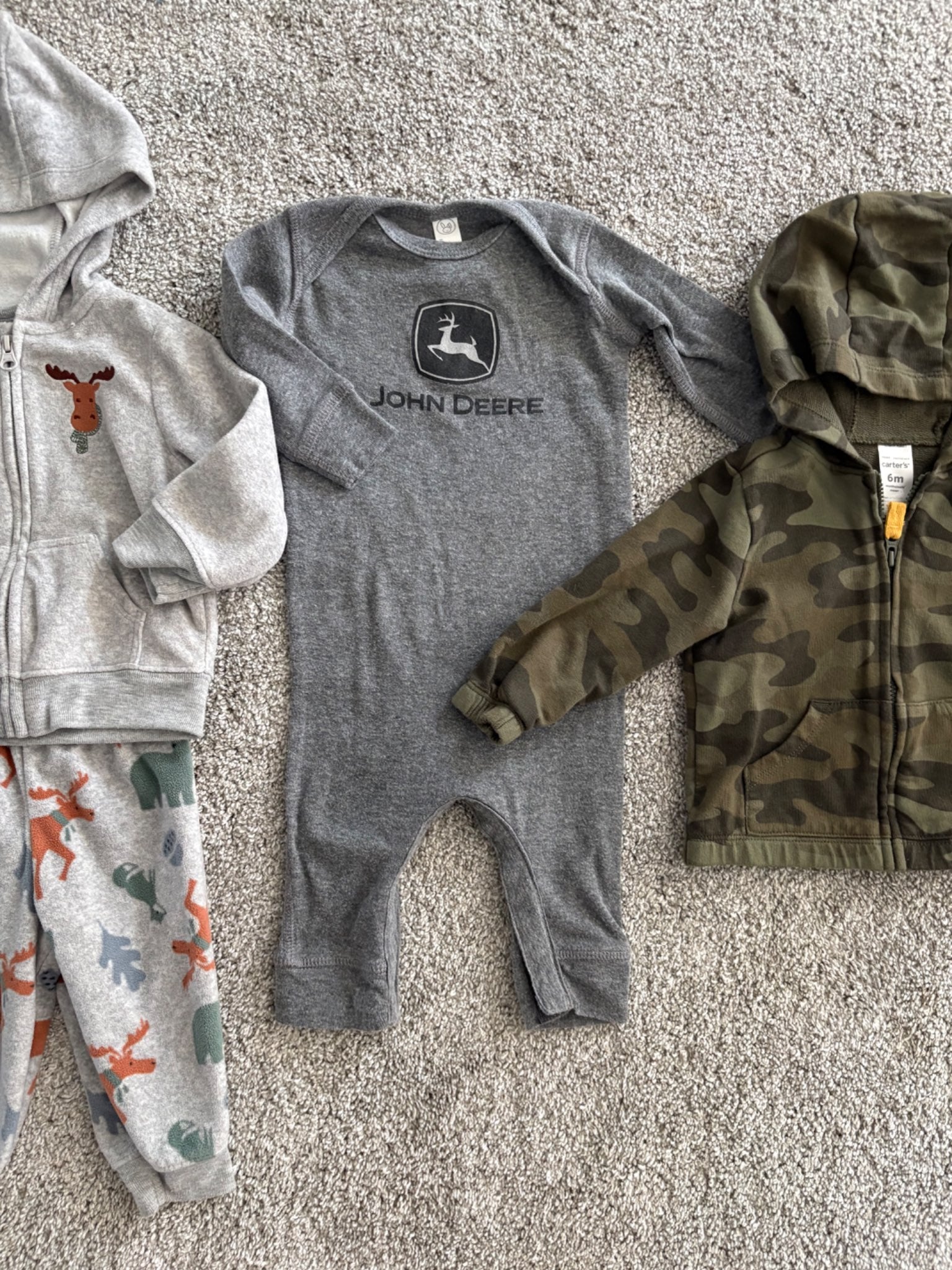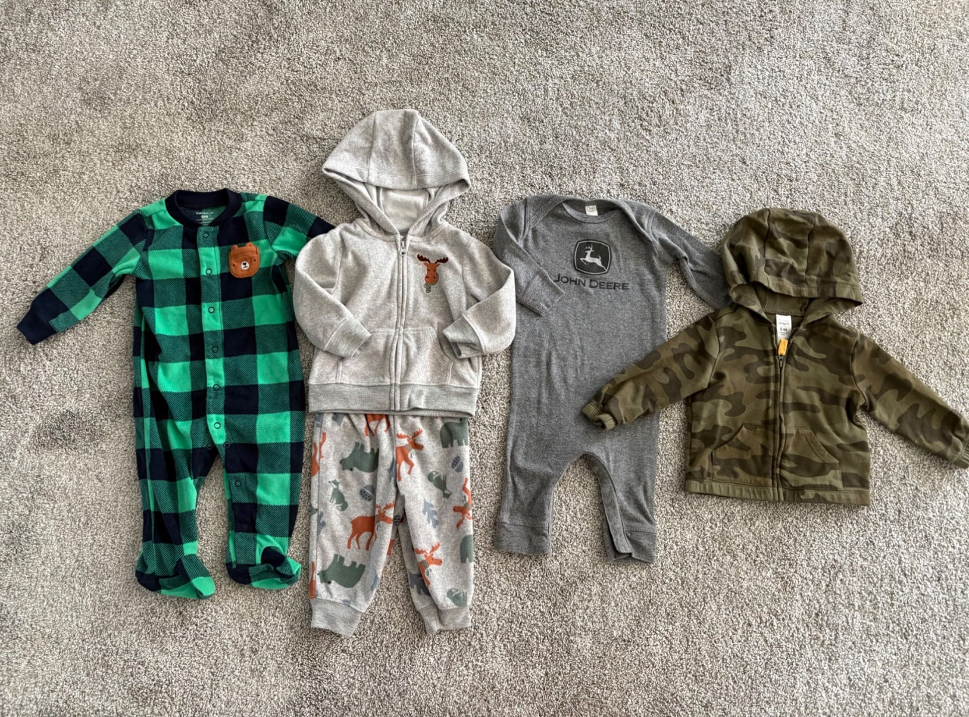 Description : This bundle is stretchy, cozy and in great condition for the colder months! The camo jacket is NWT from the Bay, the brown sweatsuit is George brand and is very soft, and the Bear Onepiece is Carter's with snap closure legs. Excellent condition!