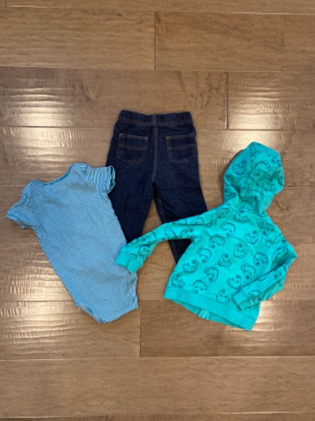 Description : Includes tshirt onesie with snaps pull on blue jeans and zip up hoodie