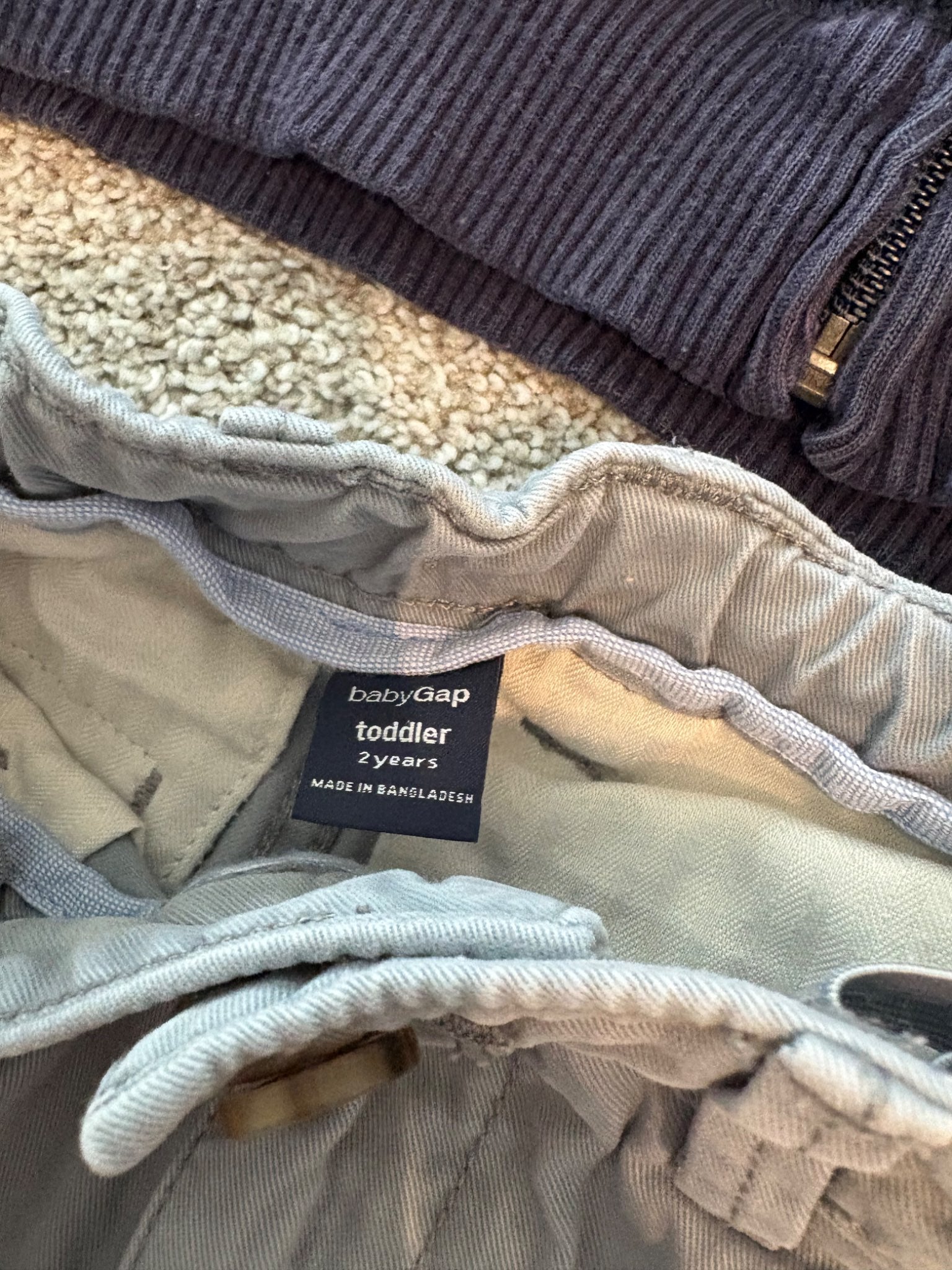 Description : Carter's khaki pants + striped sweater - this makes a really cute fall and winter outfit! Navy baby gap zip-up hoodie + baby gap pants -- some pilling on hoodie only. Old Navy polo shirt + carter's shorts.