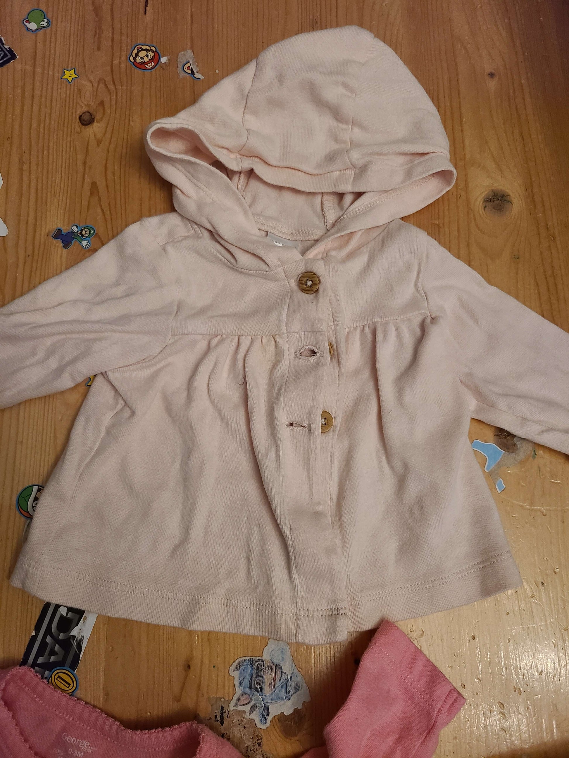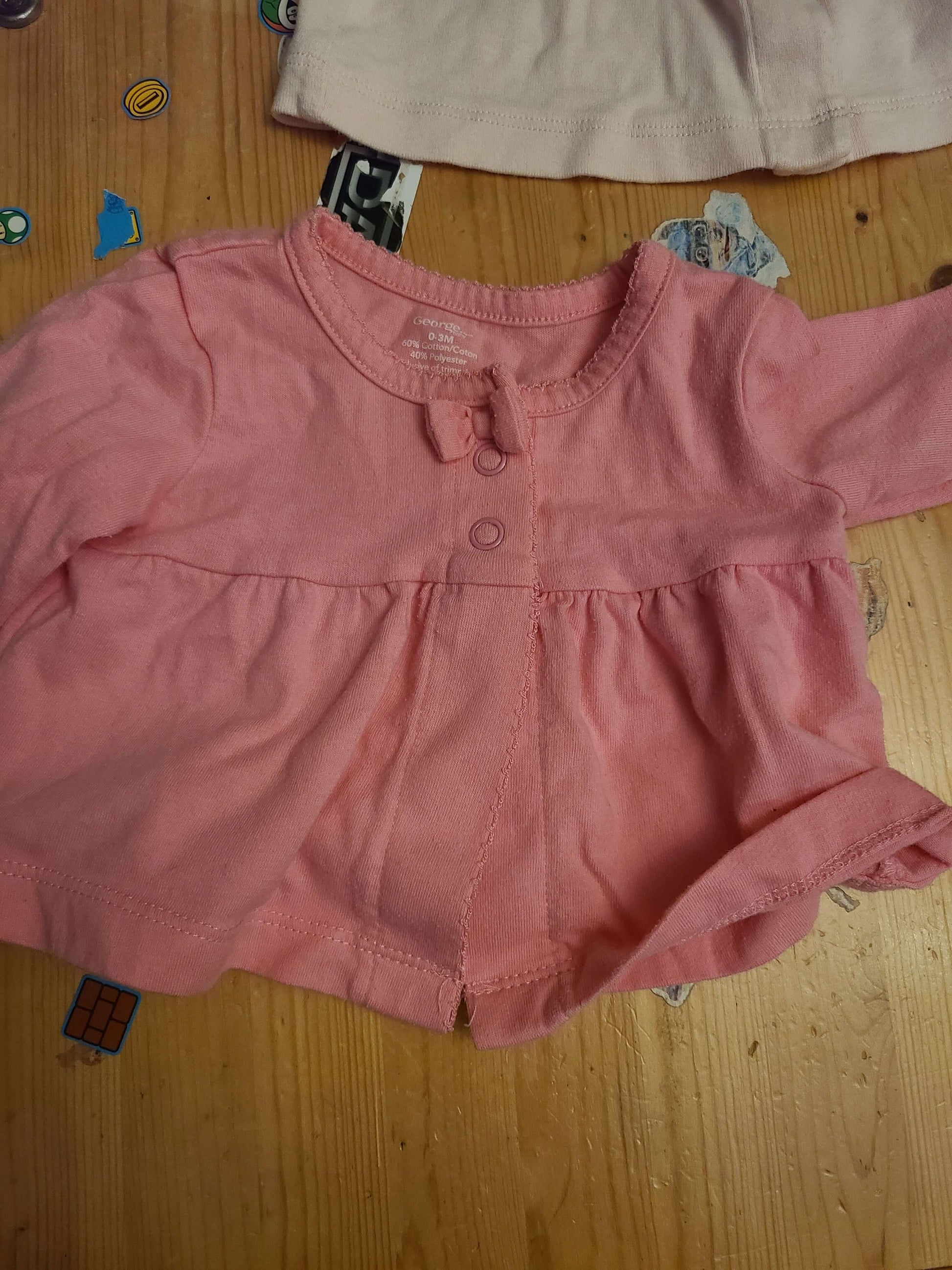 Description : 3 month bundle.. 2 long sleeve shirts ( one light pink with hood, one darker pink) and pink tootoo pants with strips
