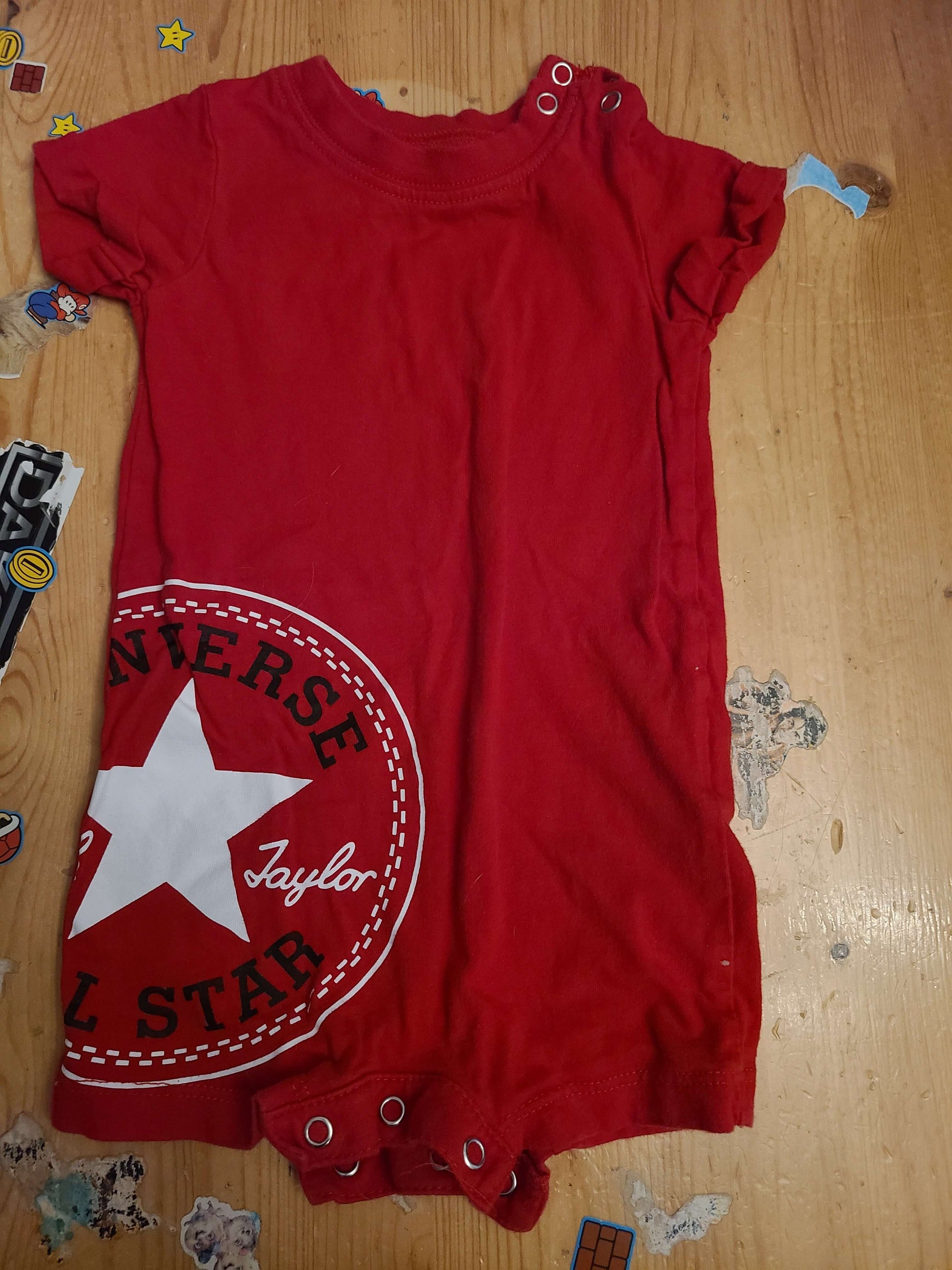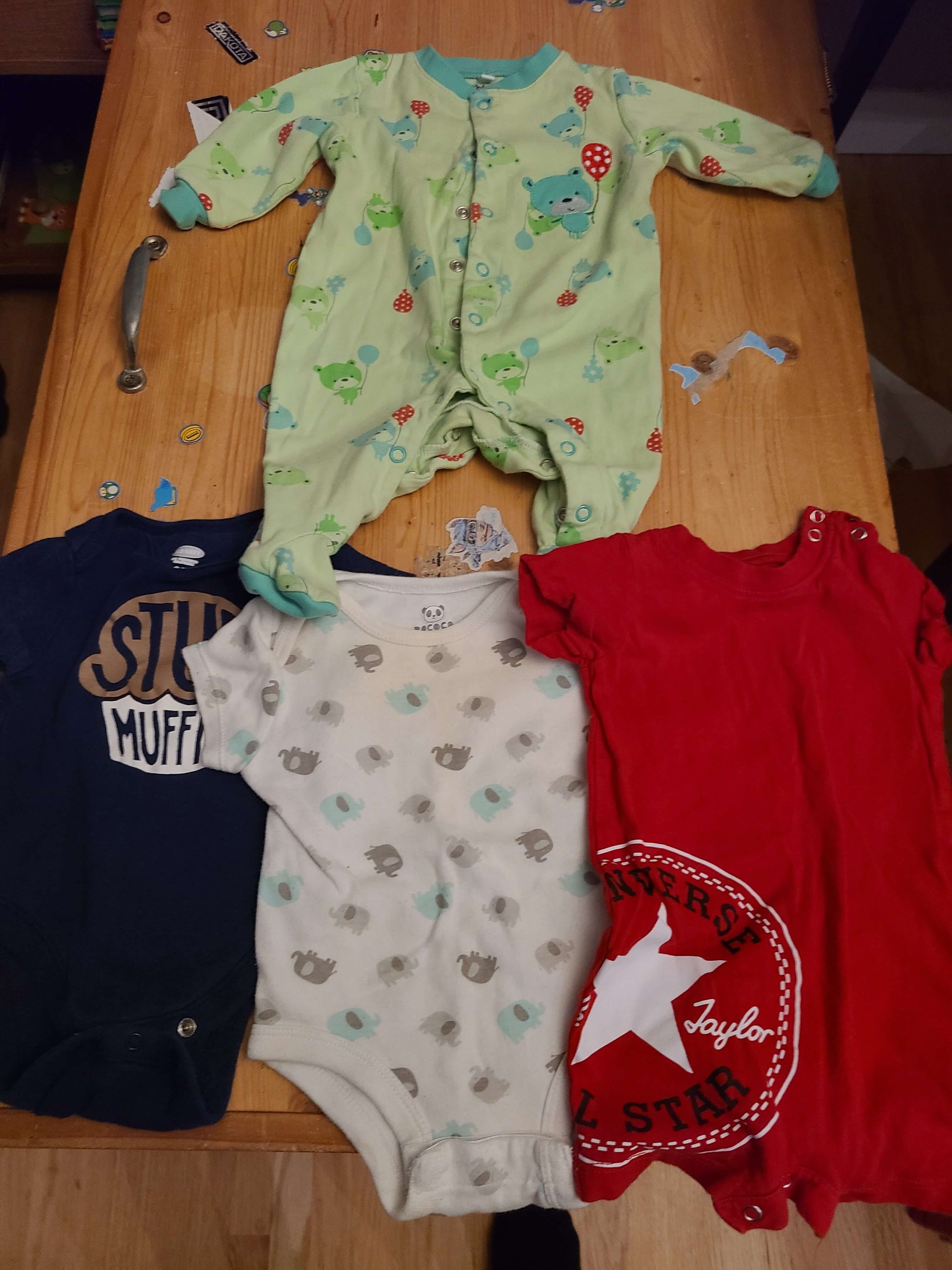 Description : 3 month bundle.. one pekkle sleeper (green with bears) and 3 onsies ( one blue with stud muffin, one white with elephants and one red with converse)