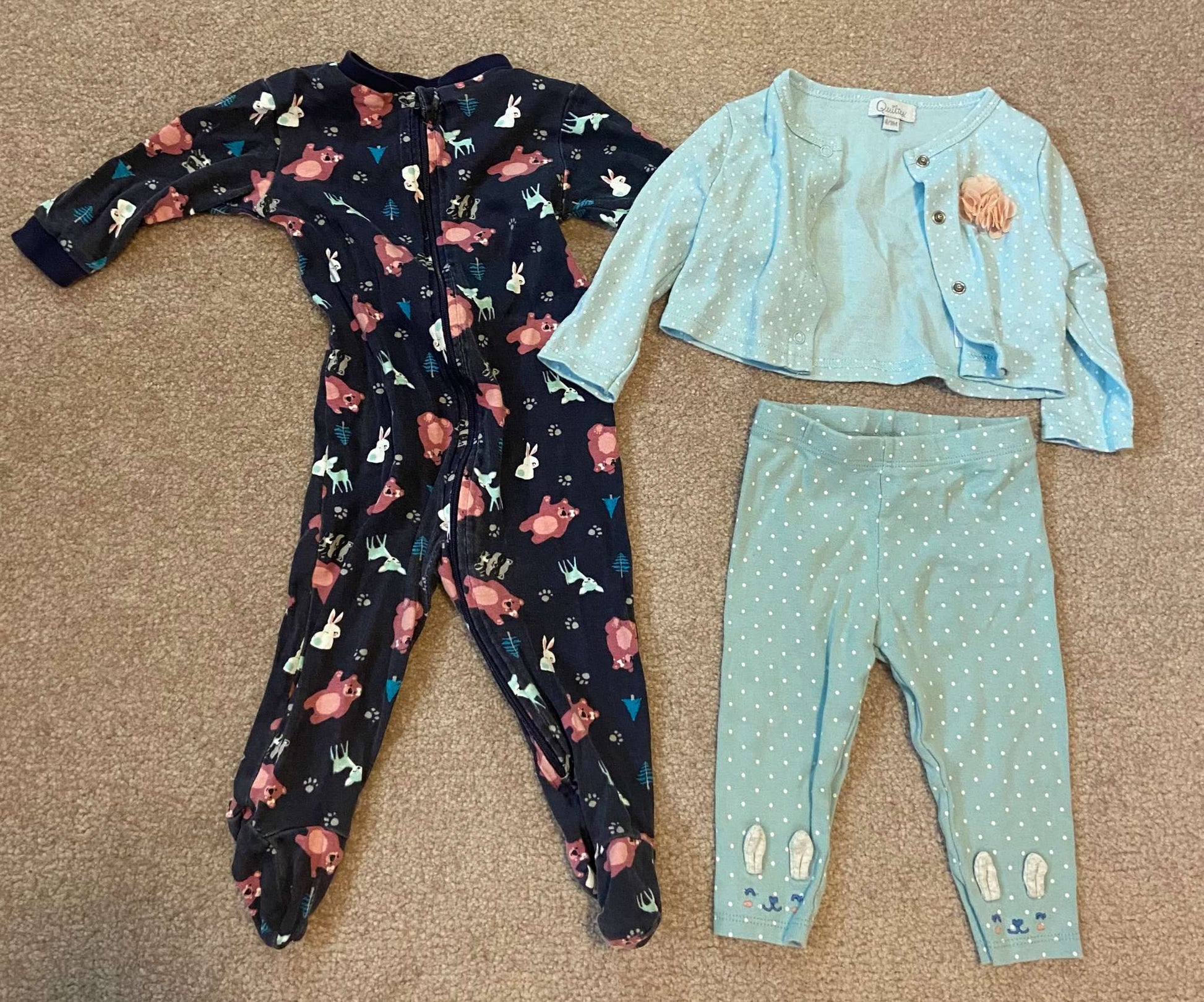 Description : 3-Pack, 6-9 Month. Pajamas are George Brand and labeled as 6-12 month. Pants are Carter's brand and are labeled as 9 month. Cardigan is Quiltex brand and are labeled as 6=9 mnonth.