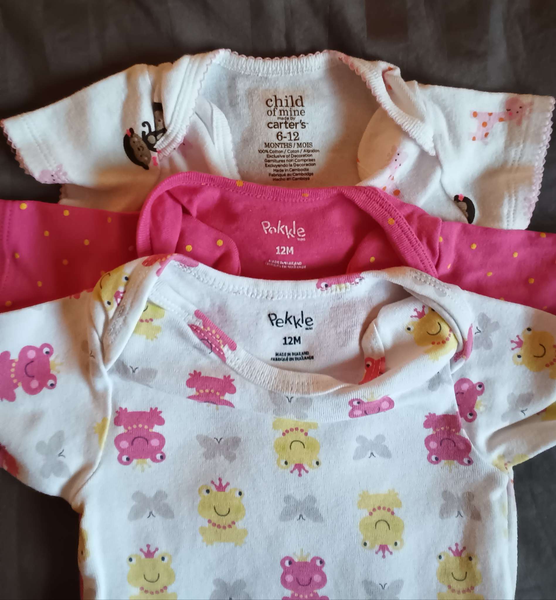 Description : 2 x Pekkle 12 months onsies + a Carter's 6-12 month onsie. Short sleeves, 100% Cotton