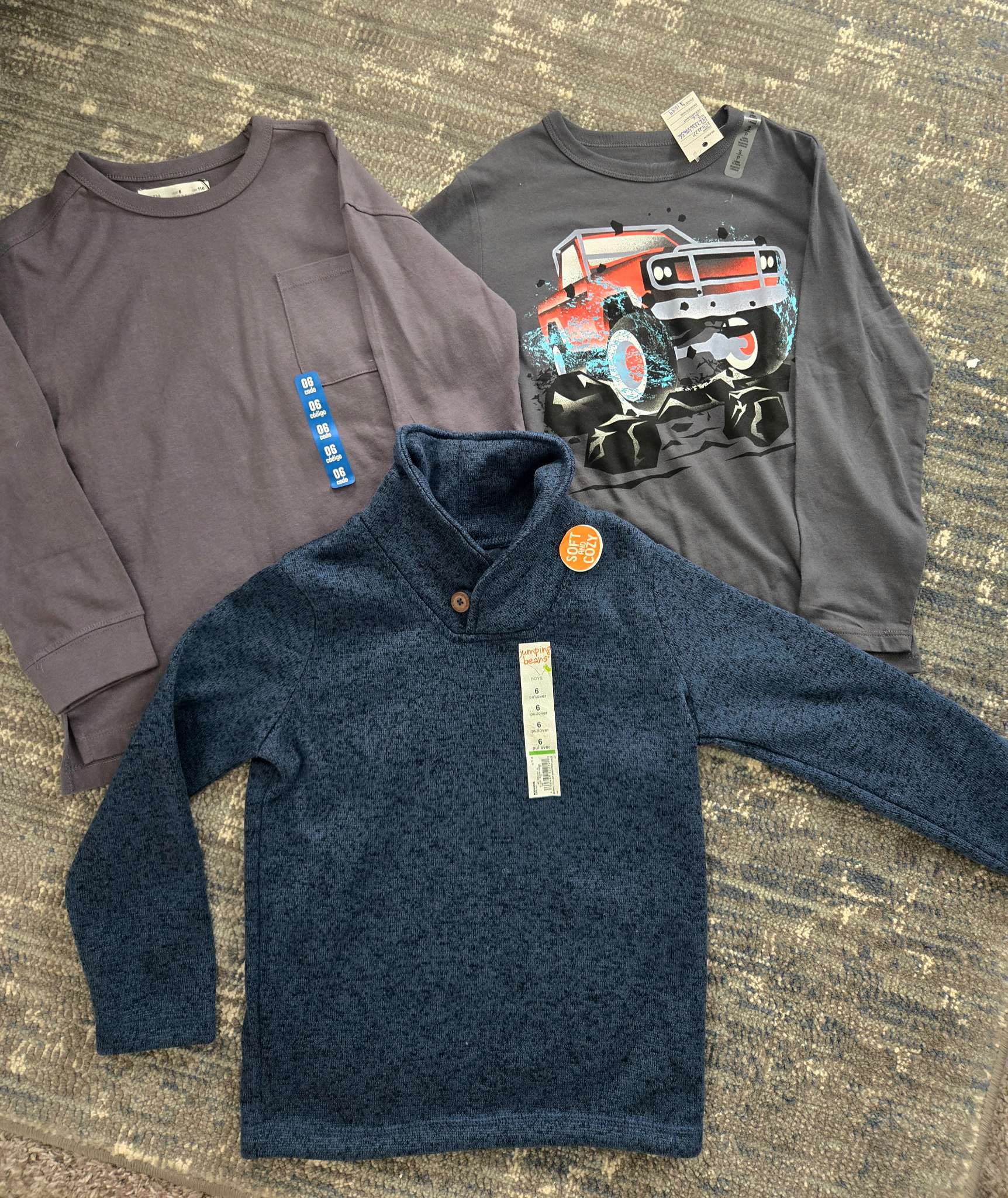 Description : 3 Pcs Bundle ( 2 Long Sleeves and 1 Sweater) Brand New 6T Children's Place -Truck Long Sleeves Zara- Gray Long Sleeves Jumping Beans- Blue Cozy Sweater