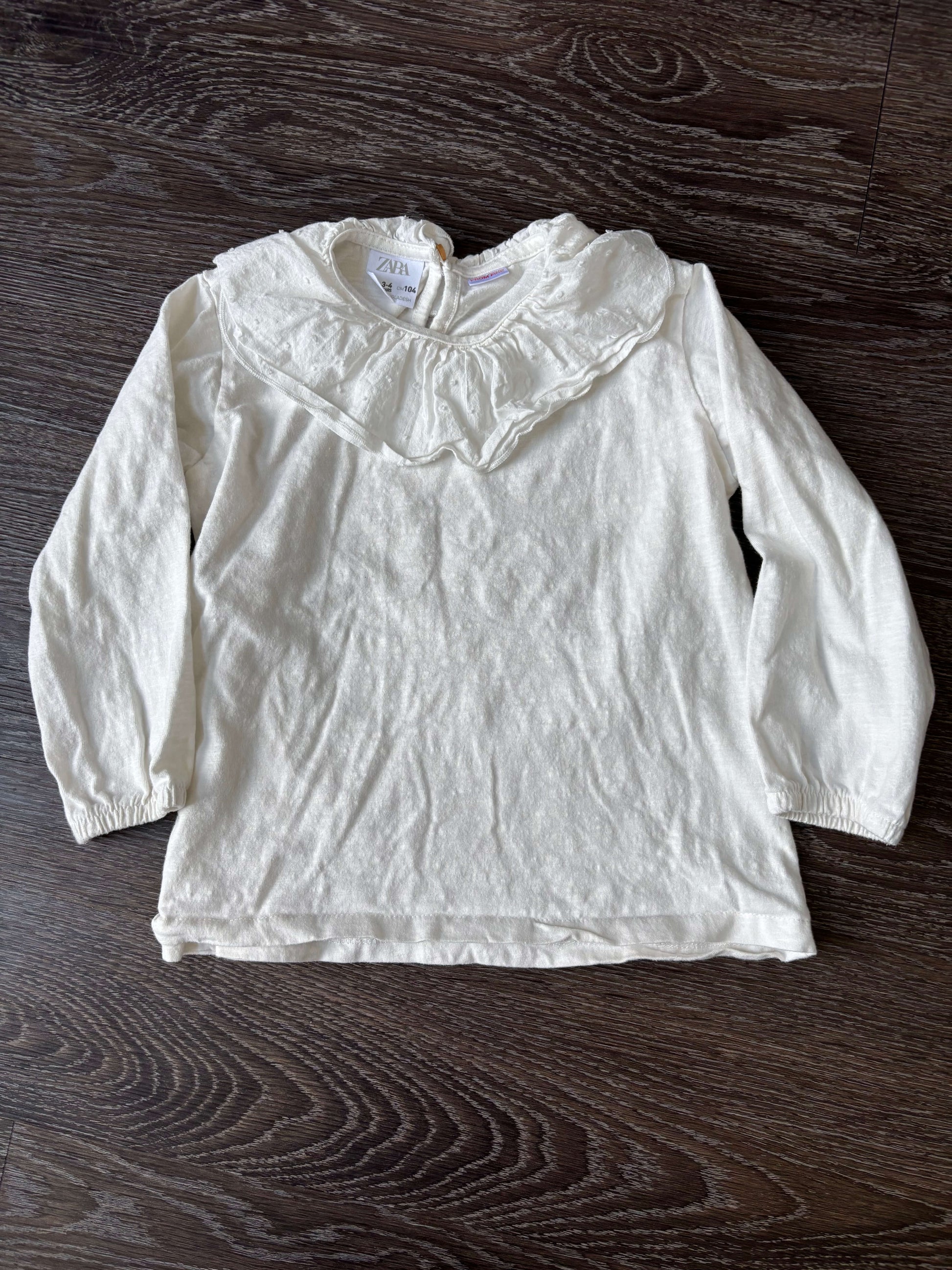 Description : 3 pieces include: ZARA brand off white, long sleeve shirt, size 3-4, worn once for photos and washed Jumping Beans denim look stretchy skirt with lining, size 3T. Our daughter also wore at age 4. George brand soft velour-like purple leggings. Our daughter also wore at age 4 as she is petite.