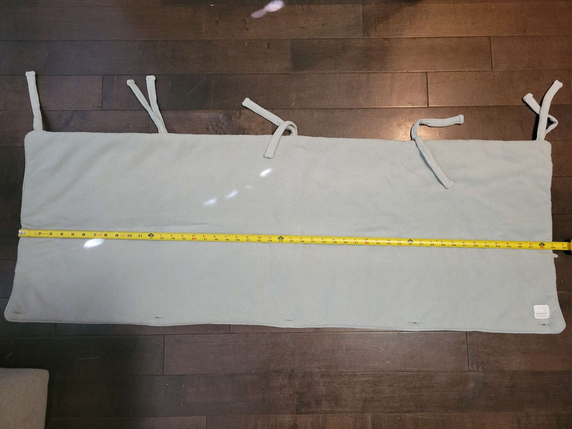 Description : Great for teething babies to prevent bite marks on crib. Soft material with waterproof underneath. 3 pieces, 2 shorter for sides and 1 longer for front. Shorter sides- 17 1/2 " x 26" Longer side - 17 1/2" x 49"