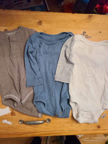 Description : 3 to 6 month long sleeve onsies.. one brown, one blue and one with and grey with bear