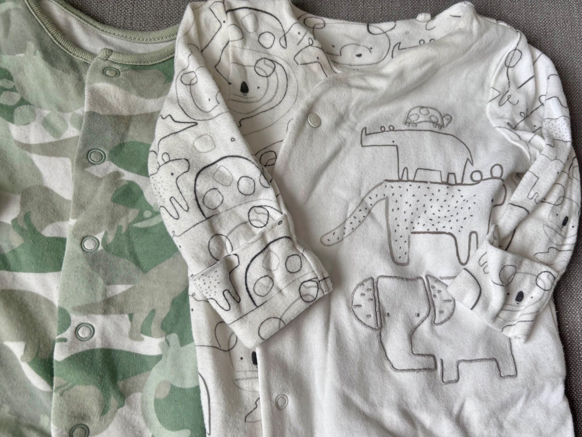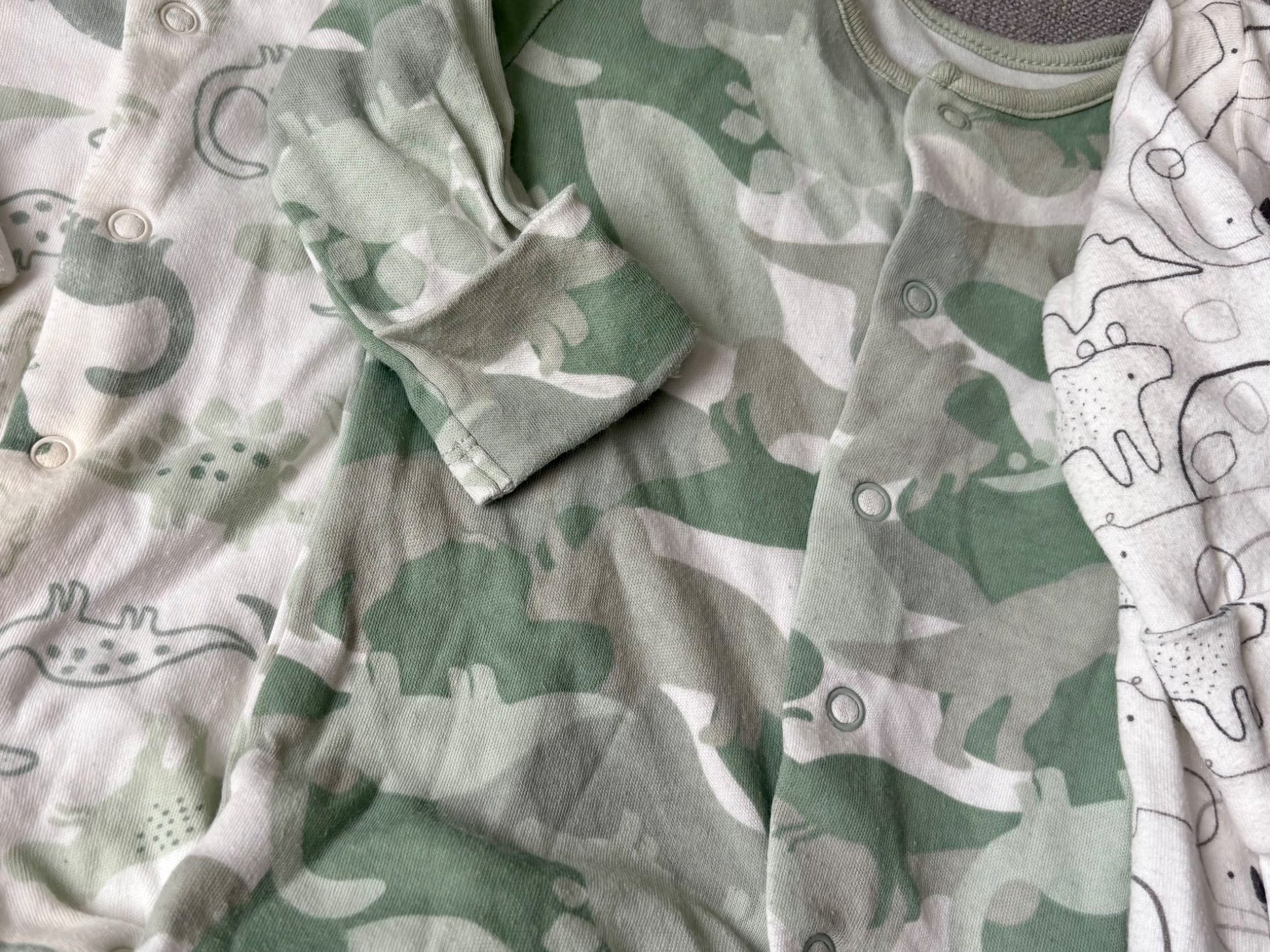 Description : 3 x pyjamas 0 - 3 months, with fold over cuffs. Dino and animal designs. Brand is Tu (from UK).