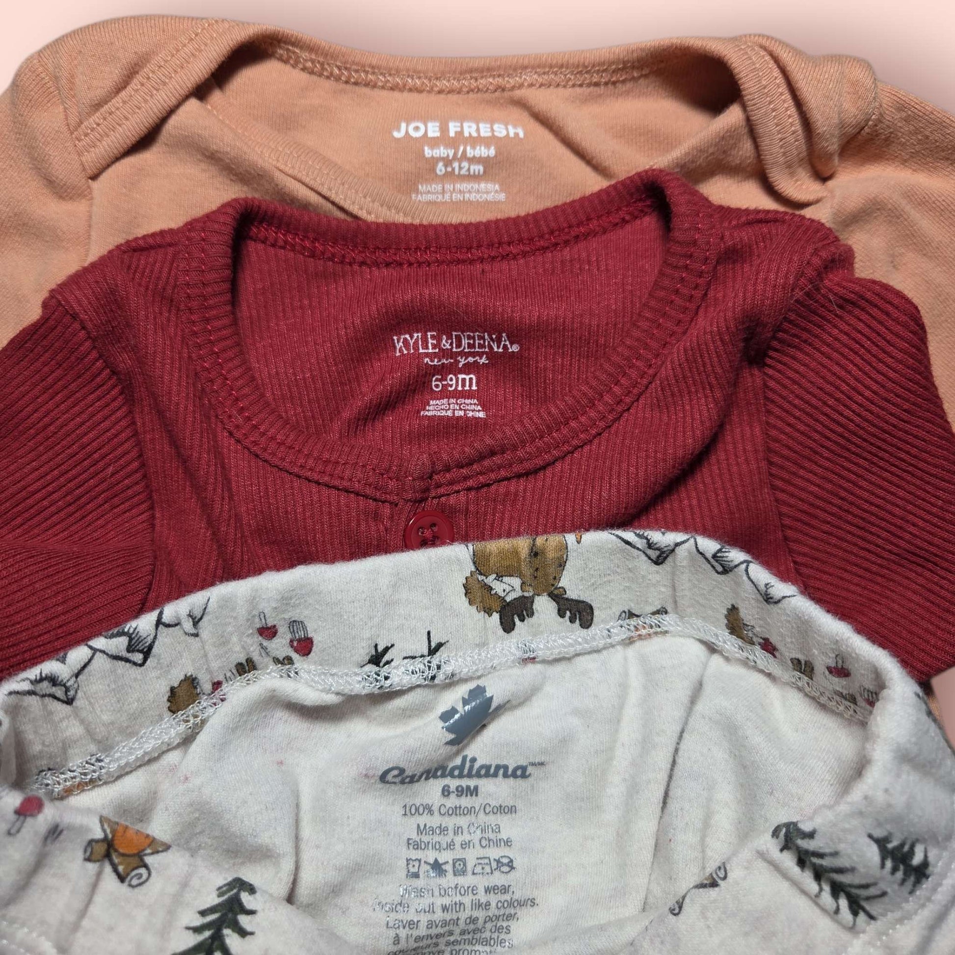 3pc 6-9m set brown & burgundy onesies and winter theme joggers, Kids 9 Month (6-9M)