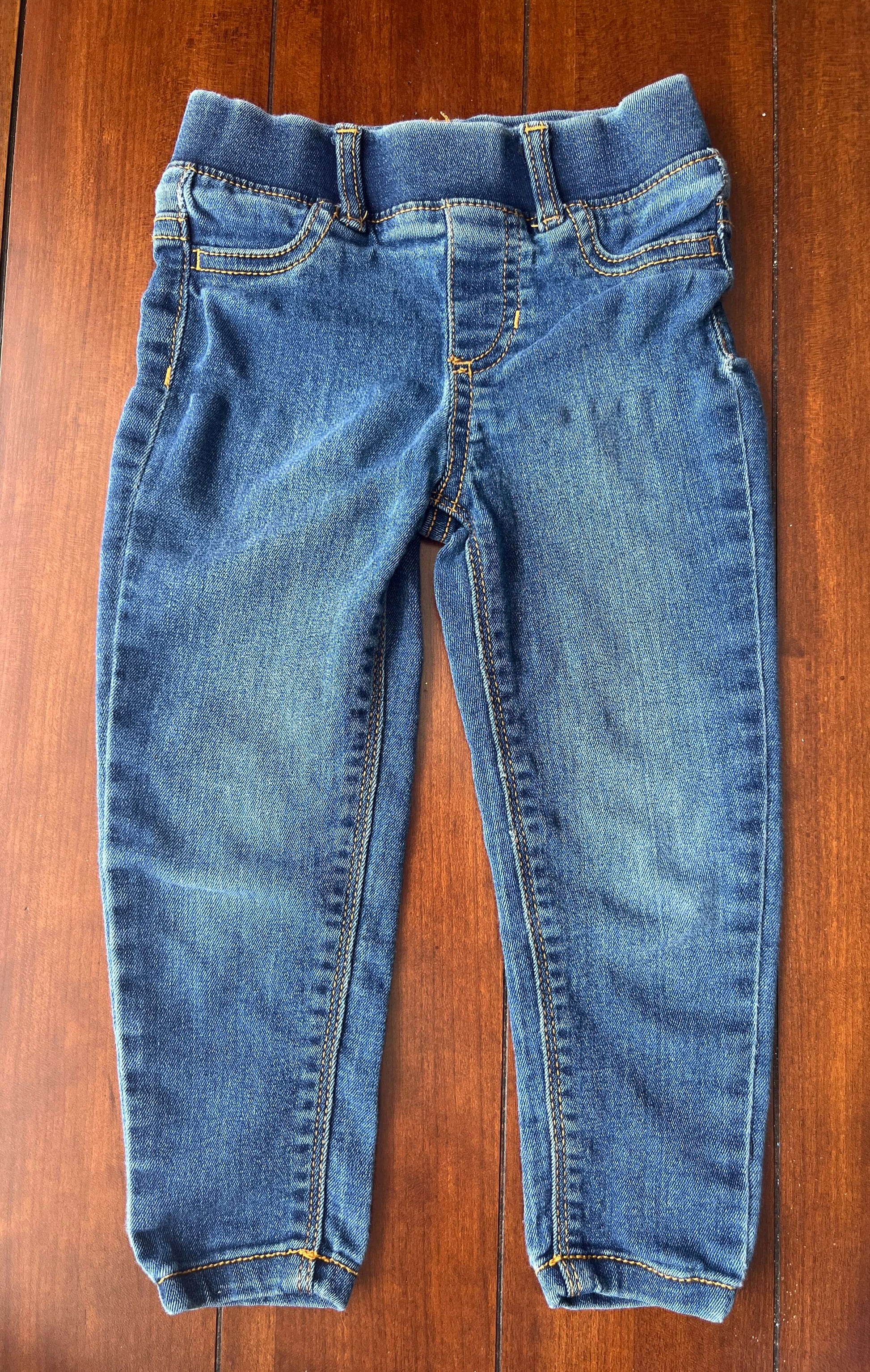 Description : Bundle of size 3T pants. -Plum leggings, Old Navy. Photo is showing very purple, but I would definitely call them plum -Navy sweatpants w/silver sparkle flecks, George -Denim pants, Joe Fresh. Small area of loosened elastic just below left pocket, visible in picture. Does not impact wear. -Navy and white polka dot jeggings, Old Navy