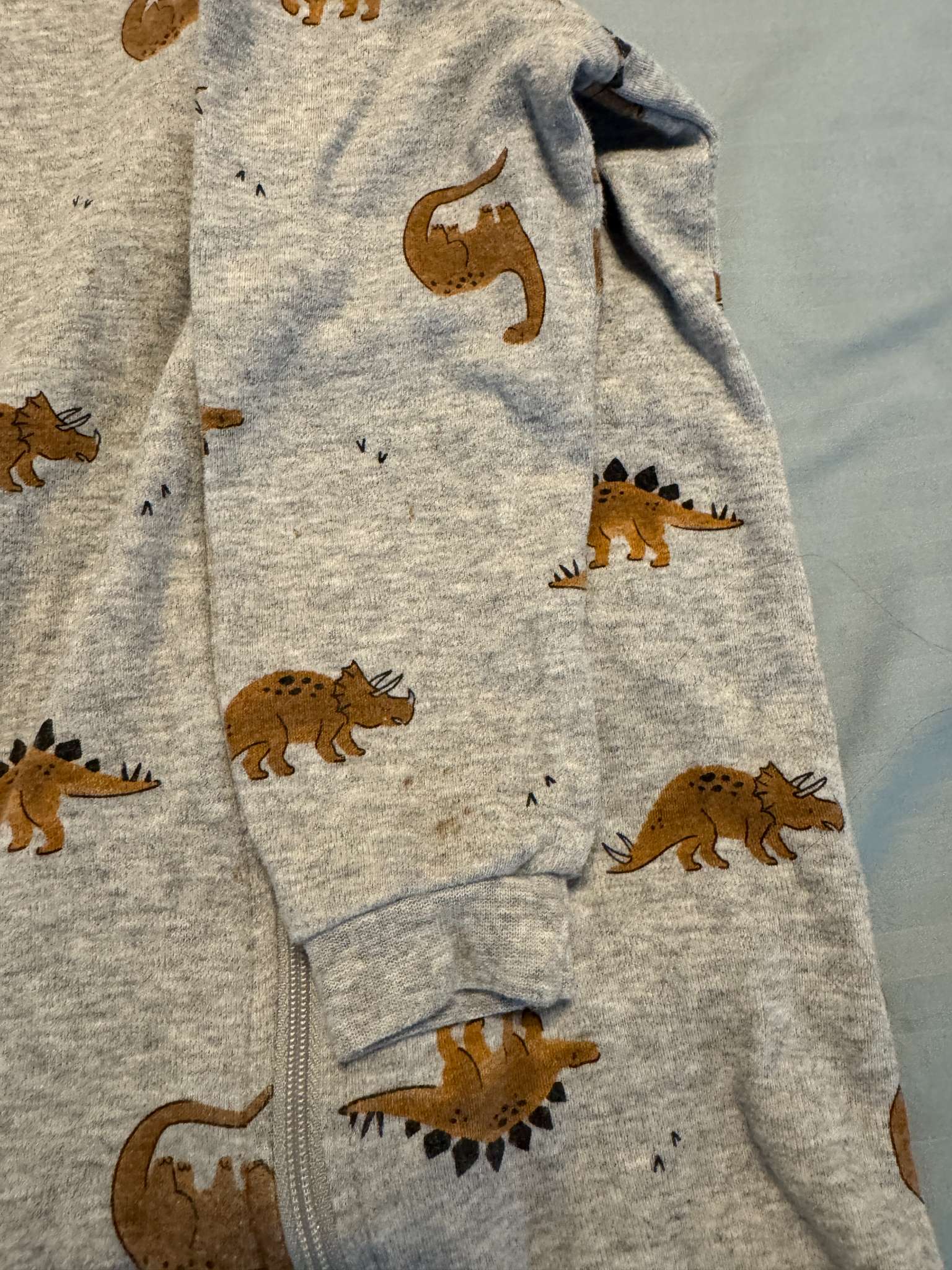 Description : Four (4) footed pajamas from Costco exclusive brand Pekkle. Dinosaur pajama has some very small stains on the left sleeve, shown in last picture.