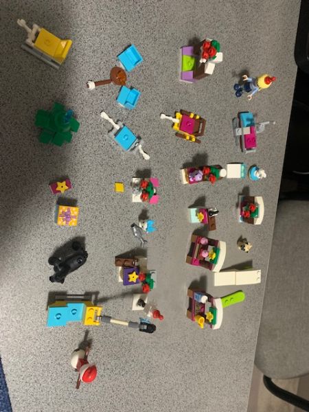 Description : 41326, Lego Friends Advent Calendar. Age 5-12. 217 pieces. We do not have the box. All pieces there. Instructions can be found online. It is a Christmas party scene. Includes a Stephanie mini-doll figure in a festive outfit. 24 buildable surprises including furry friends and their homes, Christmas tree, gifts and all sorts of surprises.