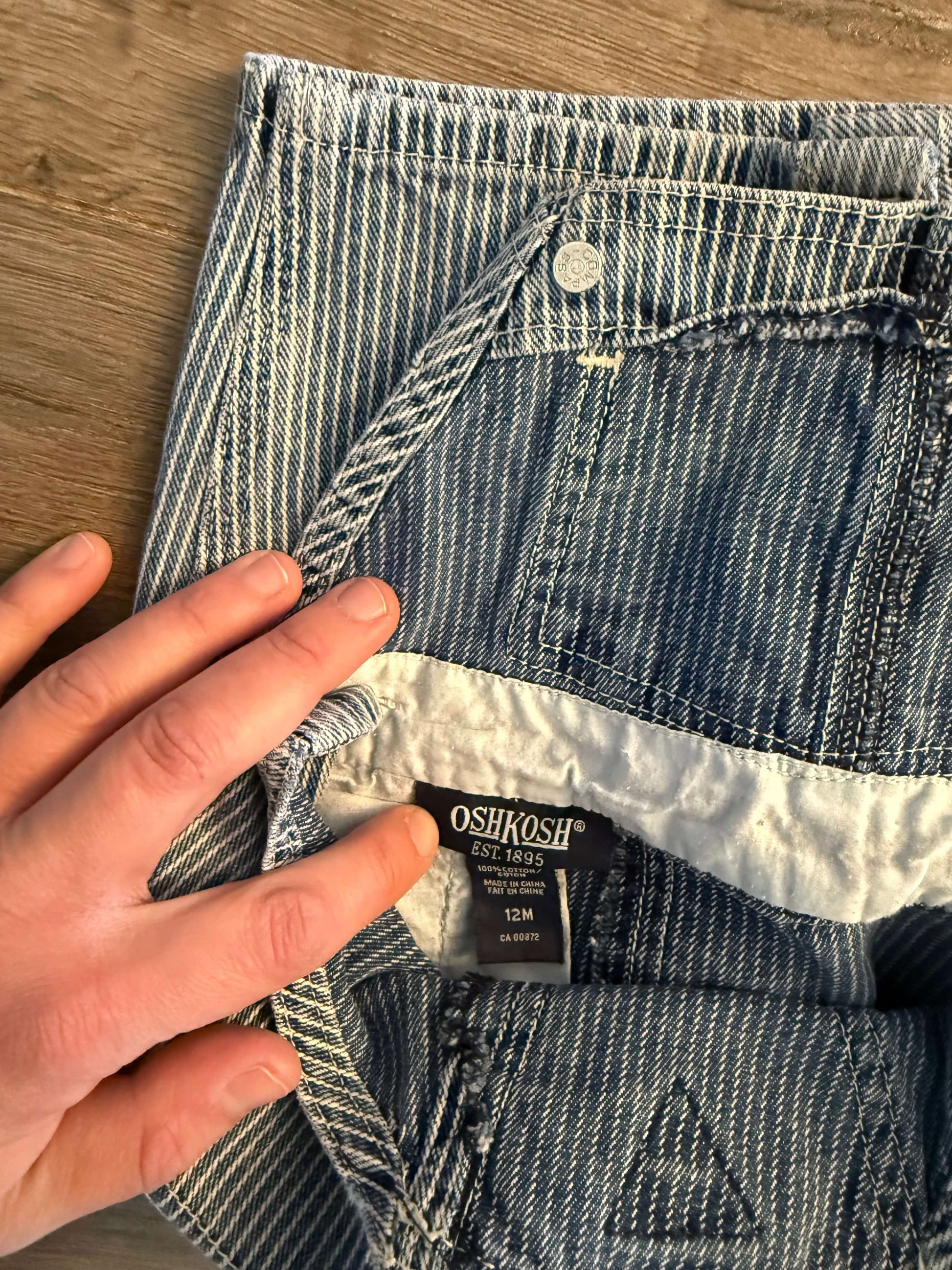 #4) Oshkosh brand denim stripe overalls, vintage style. Size 12m.