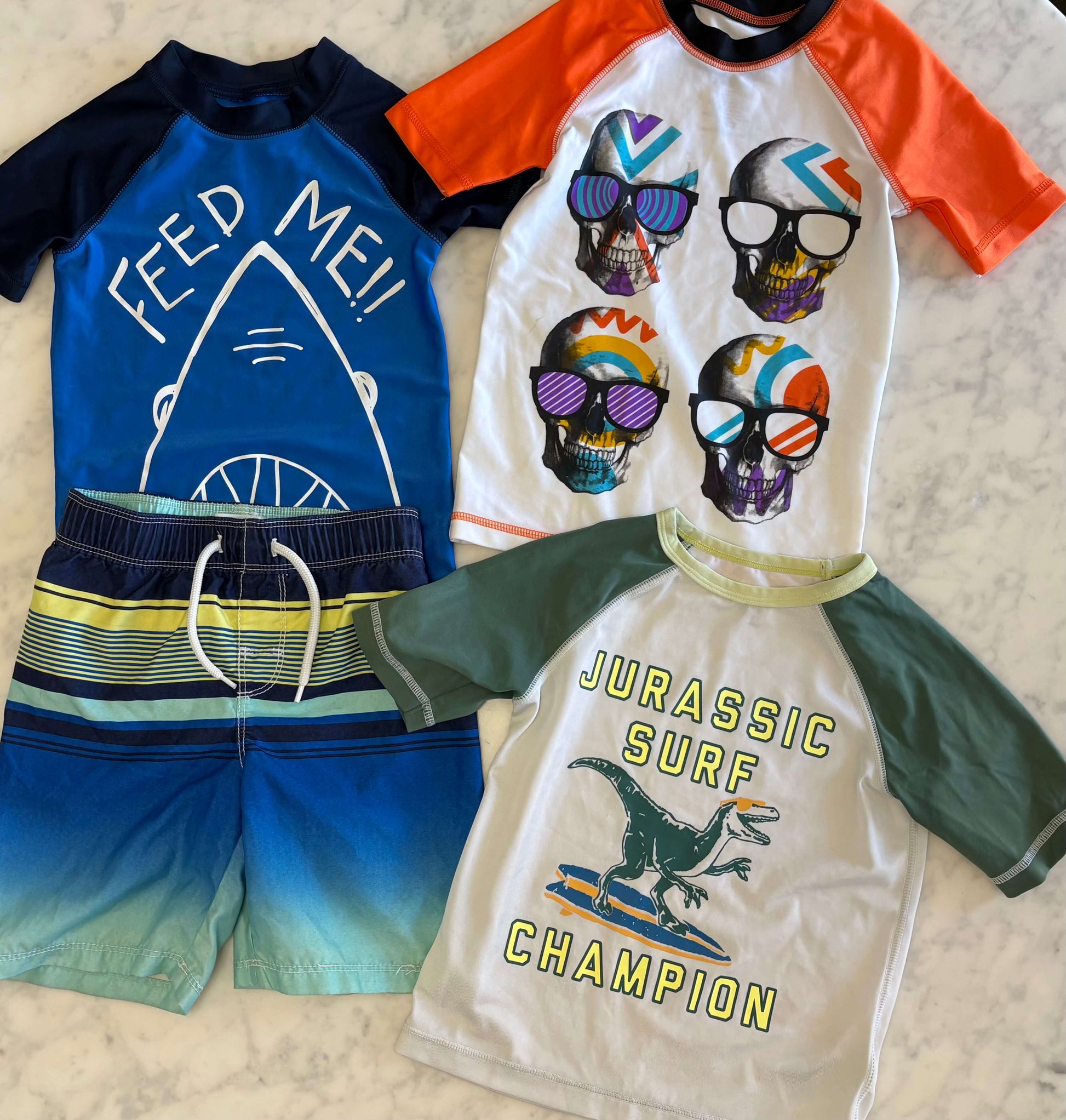 Description : 3 rashguards 1 pair of swim shorts Size 4T All in great condition, no rips or stains
