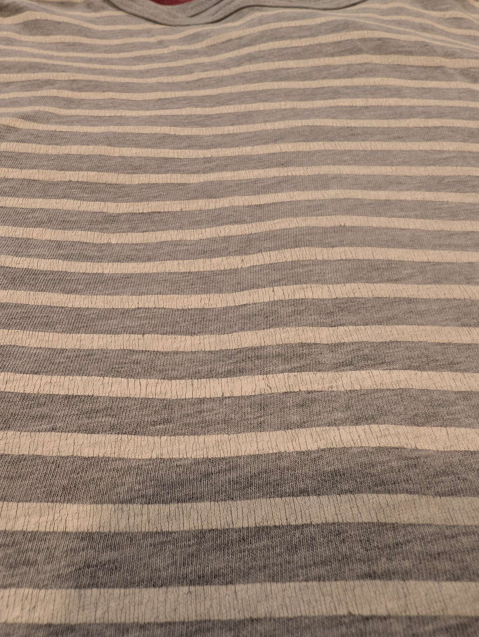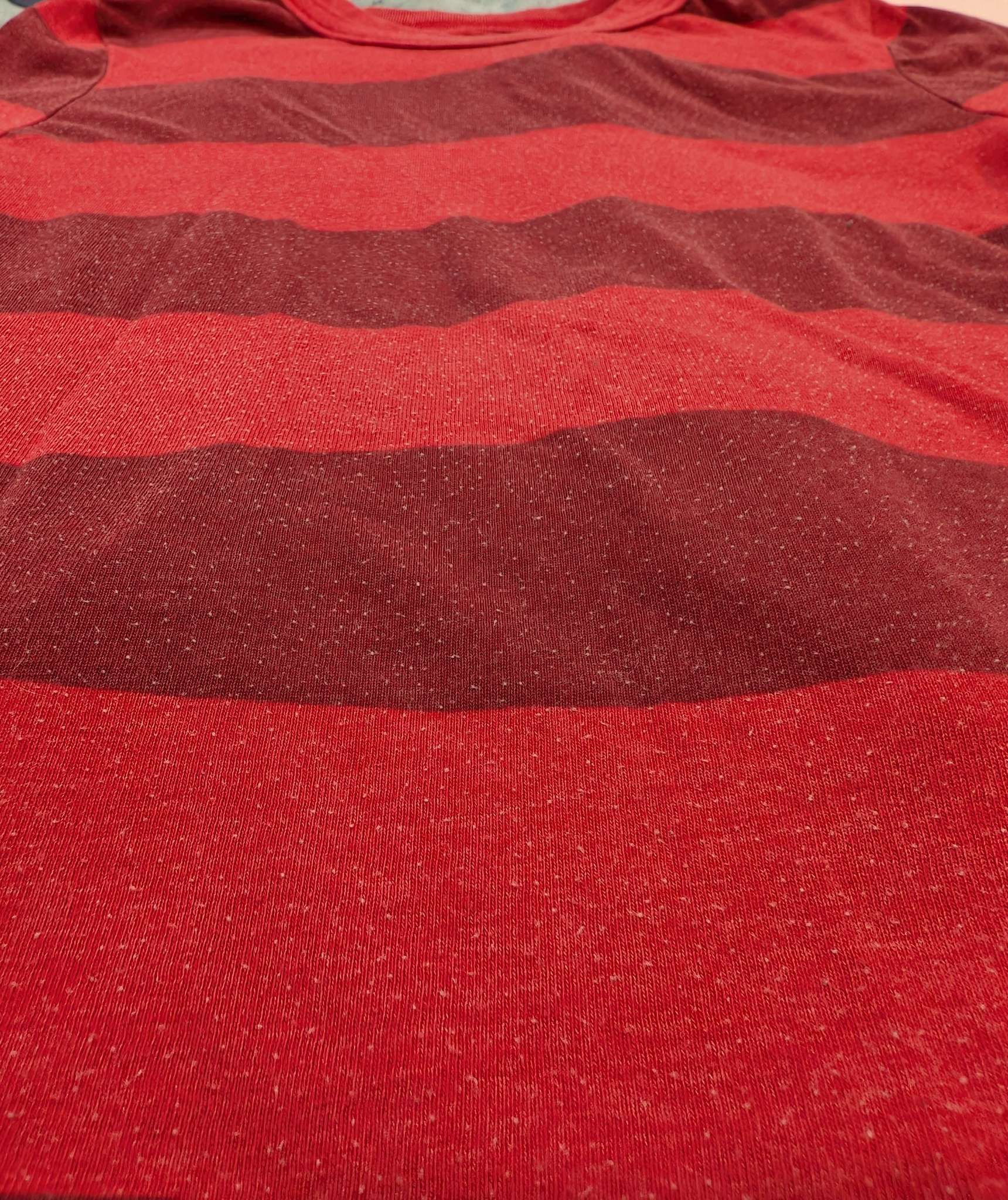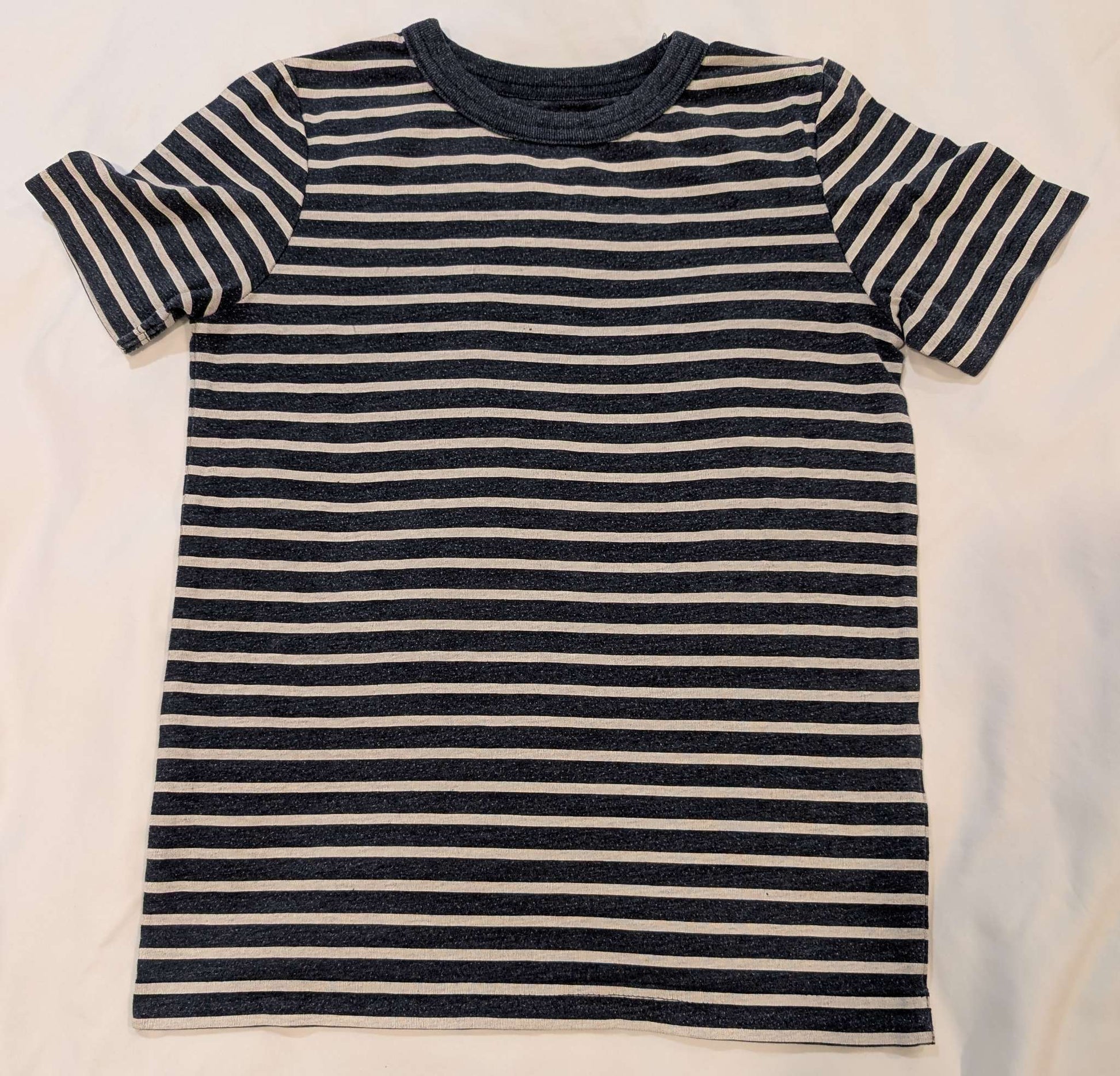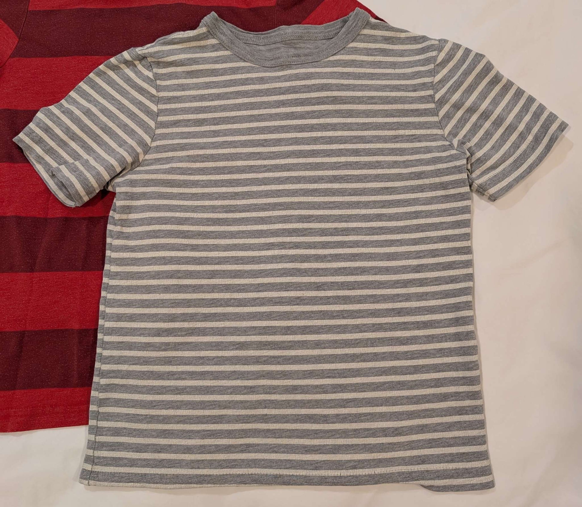 Description : 5 boys shirts, all size 6 with minor differences in length (see one of last pictures for comparison) Red shirt has consistent piling due to type of fabric, non striped shirts have flecked pattern and texture to them, grey and white stripe and blue and white stripe both have some wear to the stripes (seen in pictures when stretched slightly)