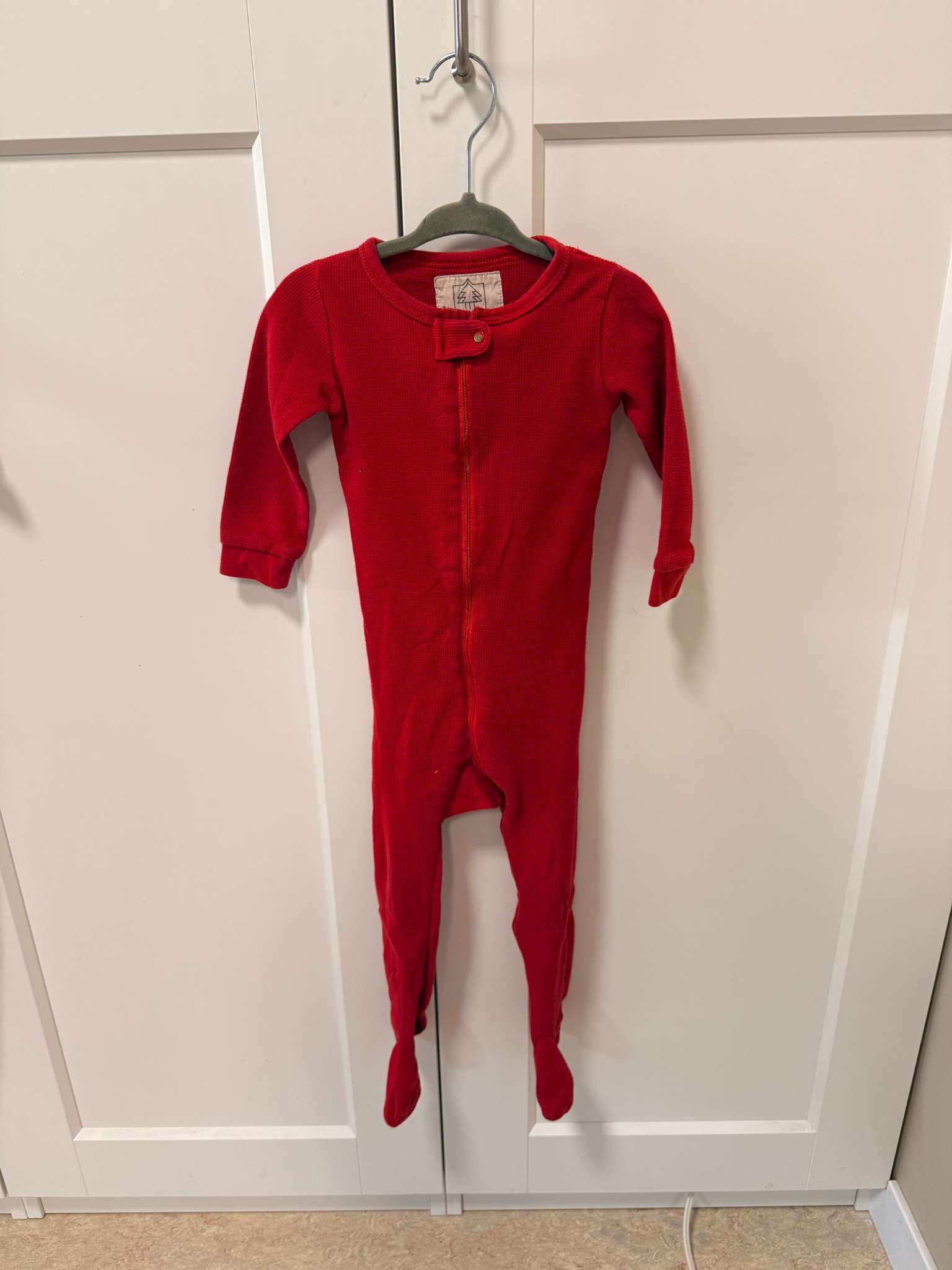 Description : Red waffle-knit onesie/footie pajamas from Arborist/Drake General Store. Zip up front.