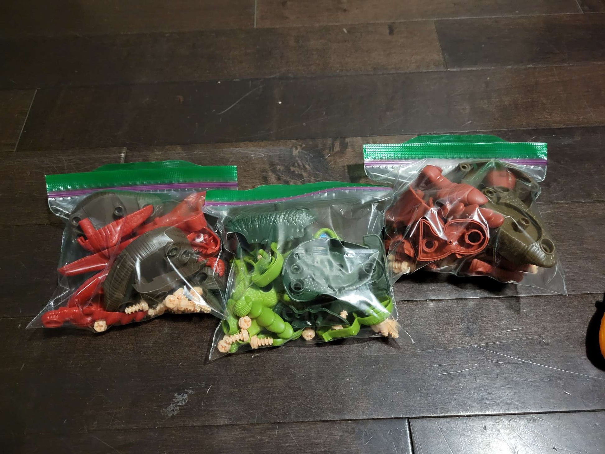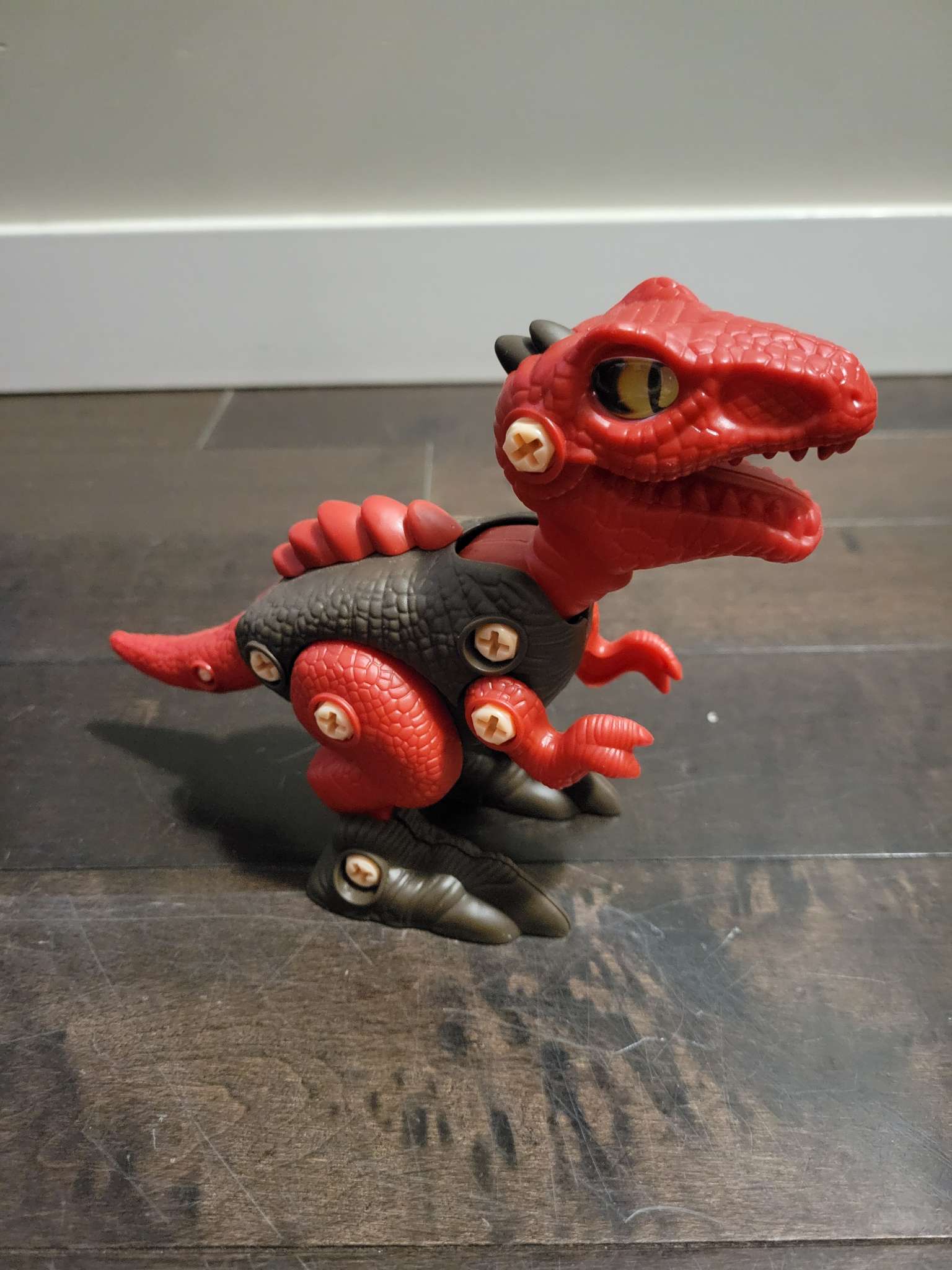 Description : Set of 3 dinasours to build, in very good condition as only built a couple times. Moveable parts, head, legs/arms and tail Includes all pieces for dinasours, 3 screw drivers, electric drill with 2 bits, extra screws and instructions