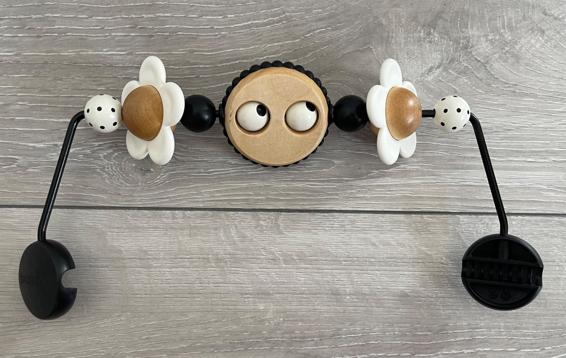 Description : Includes two machine-washable fabric seats (grey landscape pattern and black mesh), as well as a black & white googly eye toy bar.