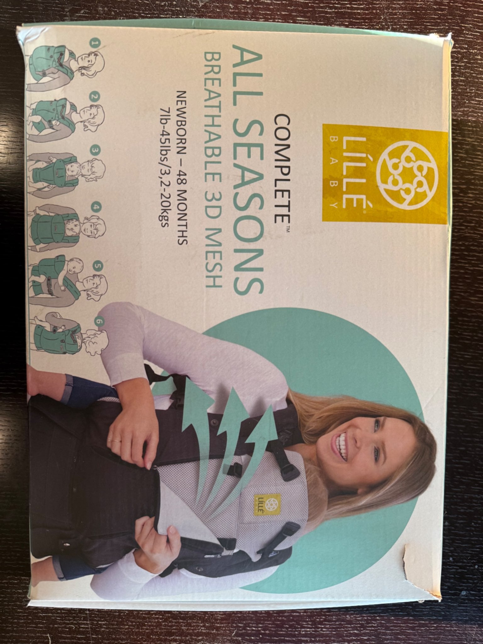Description : Complete all seasons breathable 3D mesh baby carrier by Lille Baby. Size newborn to 48 months (7-45lbs). Six different way to hold your baby. Comes with User Manual. Original price $210