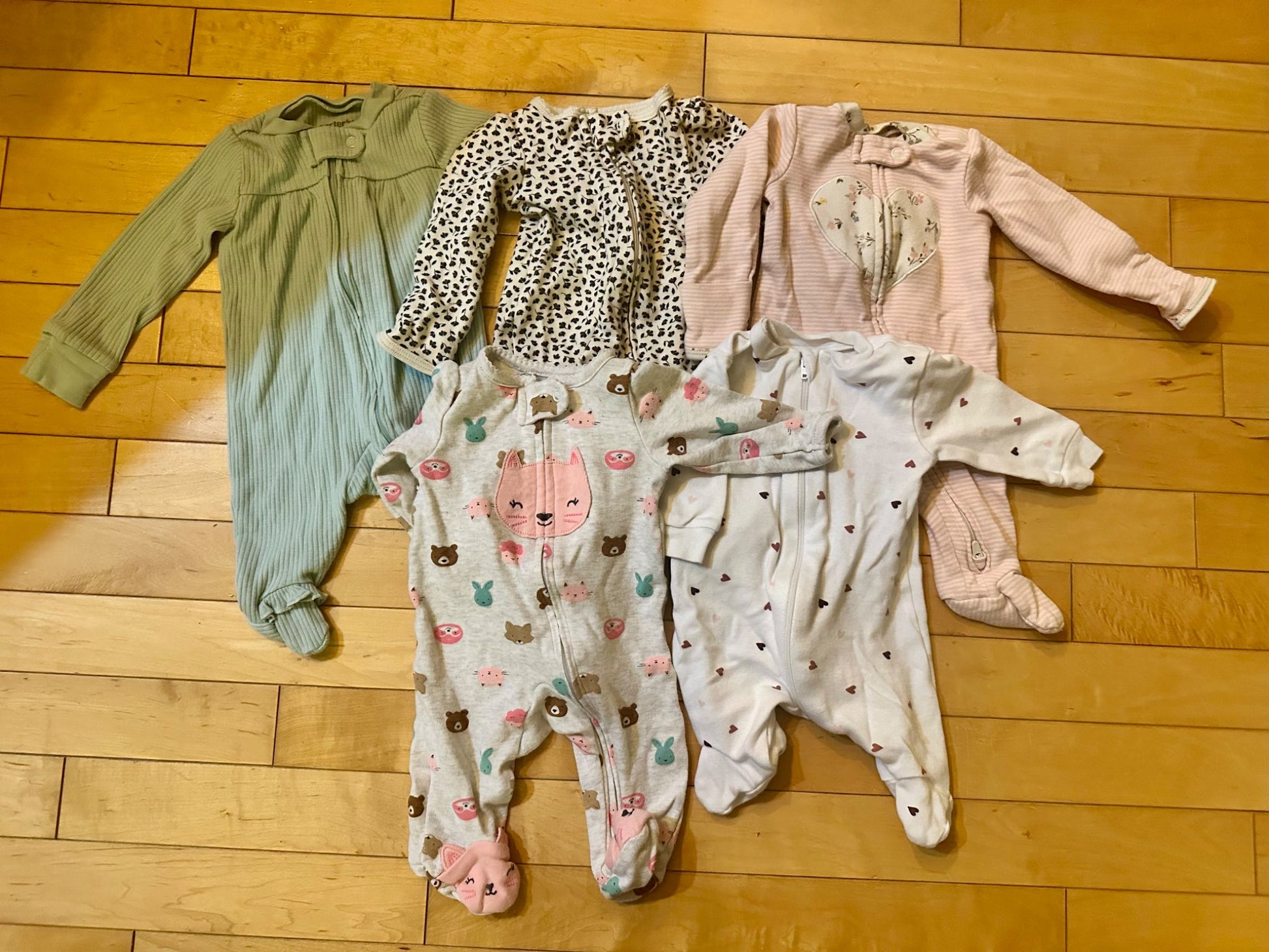 Description : 5 sets of onesies. Top row (3) form Carters, bottom left from Child of Mine and bottom right from Walmart.
