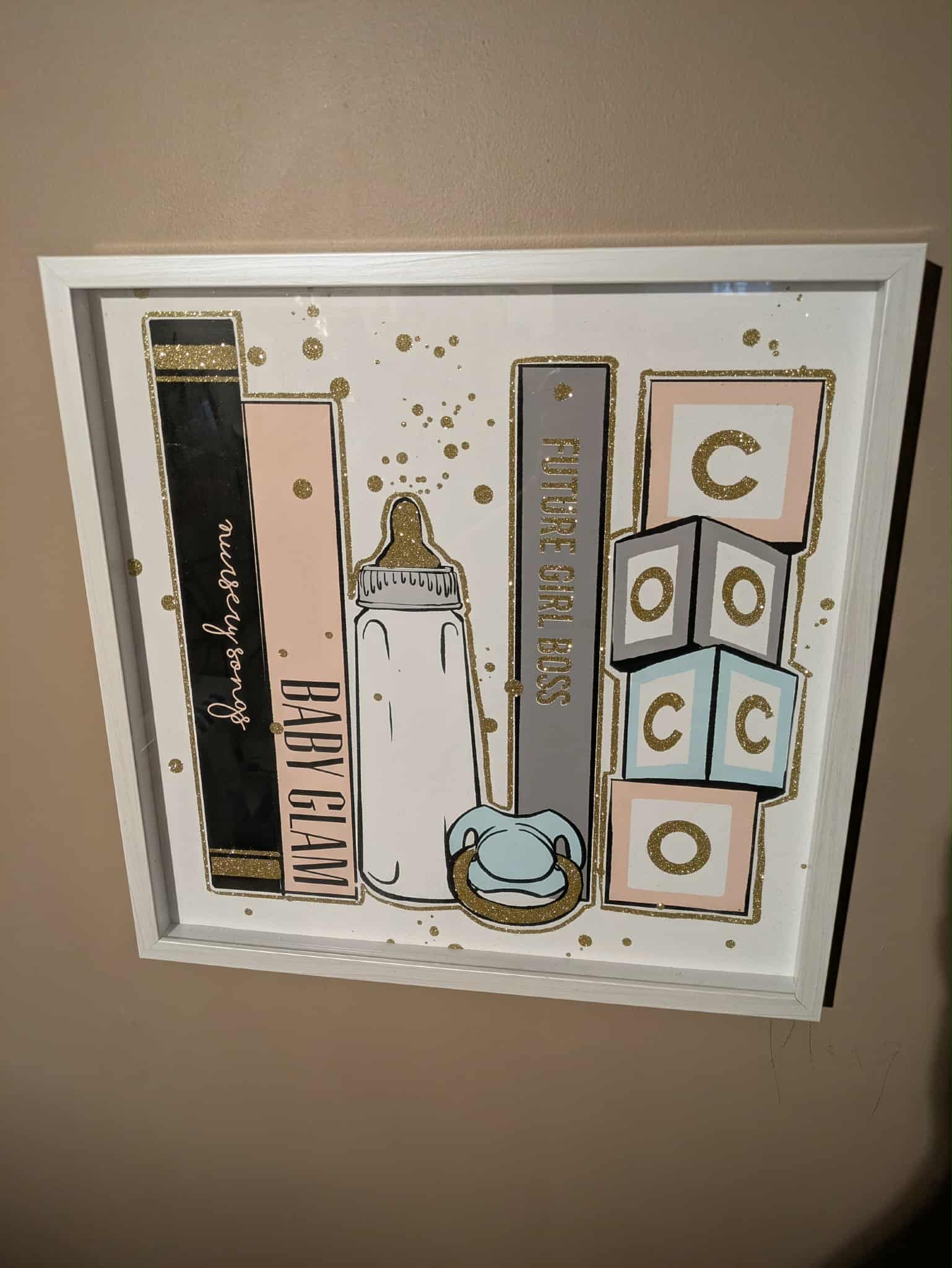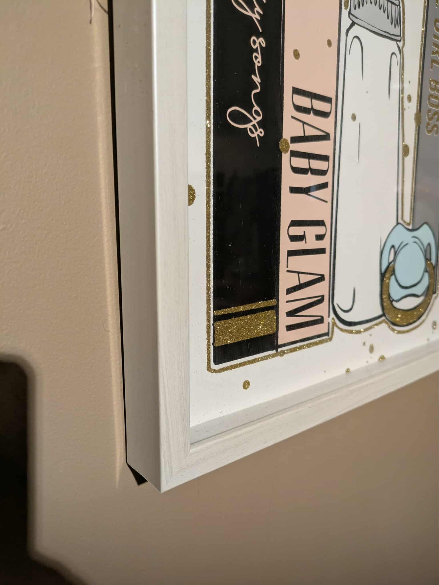 Description : Decorative girl baby glam themed photo. White frame with sparkly/pastel colored image inside. about 16x16 Inches.