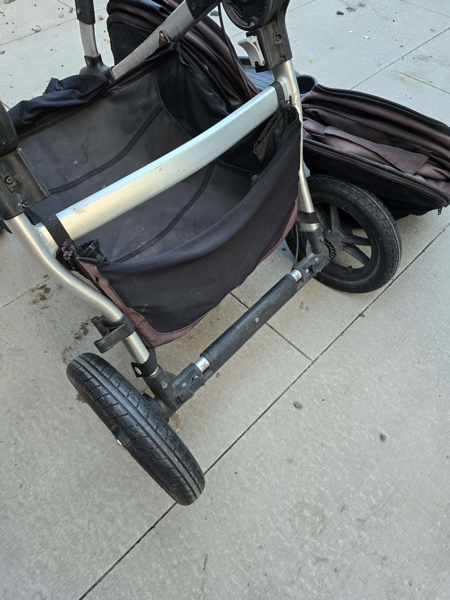 Description : Designed to keep your growing family rolling. Converts from a single to double stroller. With over 16 configurations you can customize your stroller to fit your needs perfectly. Single or double stroller option Front and back facing double stroller Large multi-position sun canopy Deep basket Easy to fold and maneuver Great for busy city streets 1 Mosquito cover 1 eating table attachment NOTES: Black color is faded from sun - It was washed to clean up - pushing handle might use a grip wrap - Pet Friendly