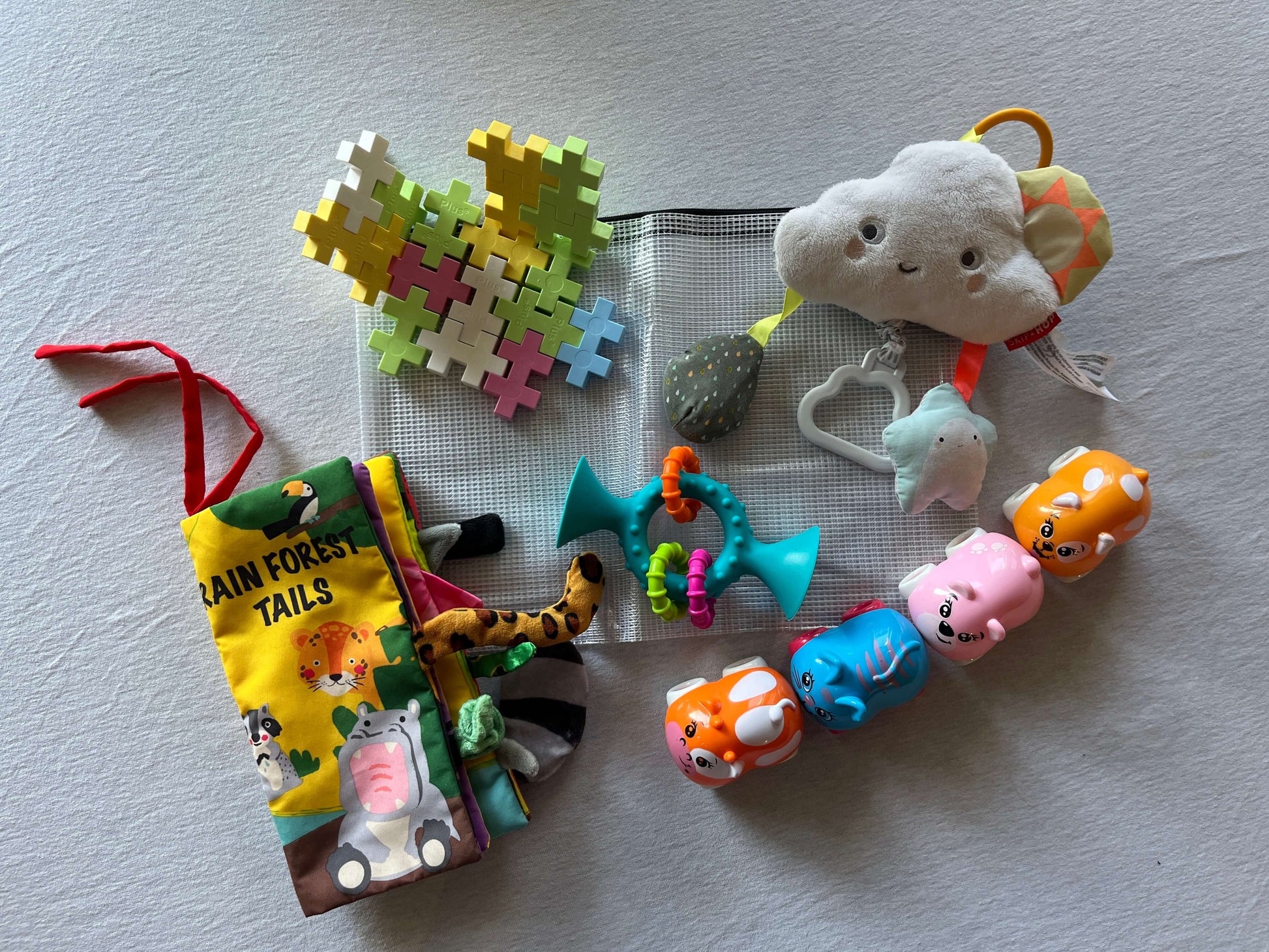 Description : Travel sized toys that will keep your little one busy at home and on the go! A pouch packed with baby friendly toys to keep your little one entertained in a plane, train, car, boat or even at a restaurant. Appropriate for babies around 6 months through age 2. All items are in excellent used condition and have been sanitized/cleaned thoroughly.