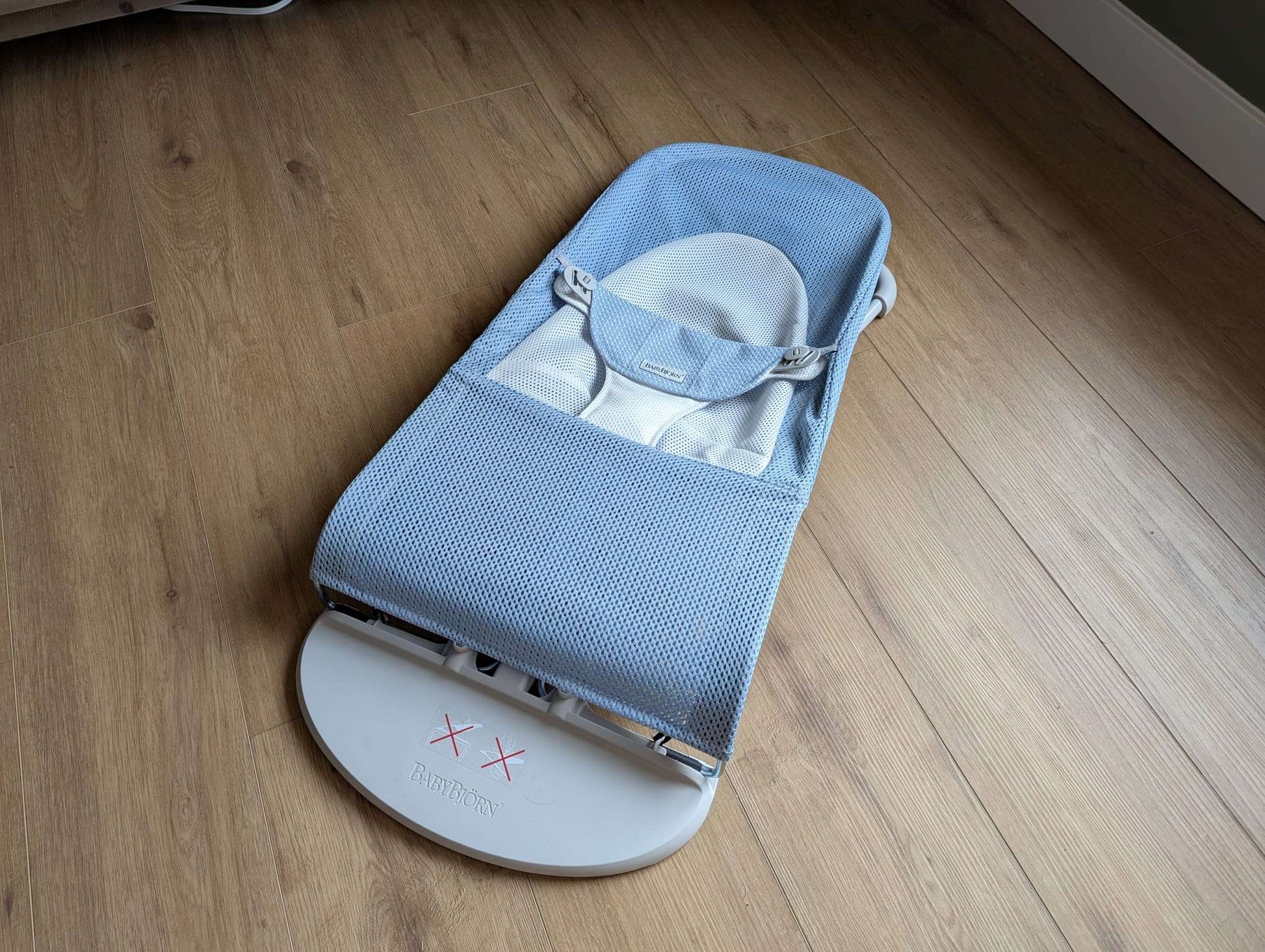 Description : A sleek and comfy bouncer that features a lightweight soft mesh fabric (in sky blue/white with grey base), ergonomic design, and natural bouncing motions.