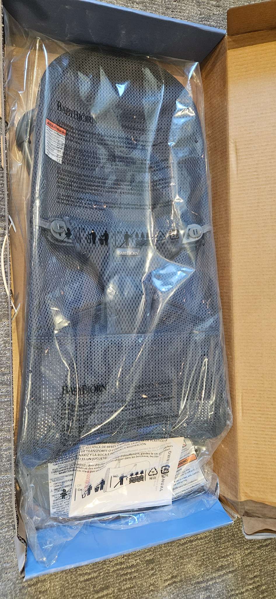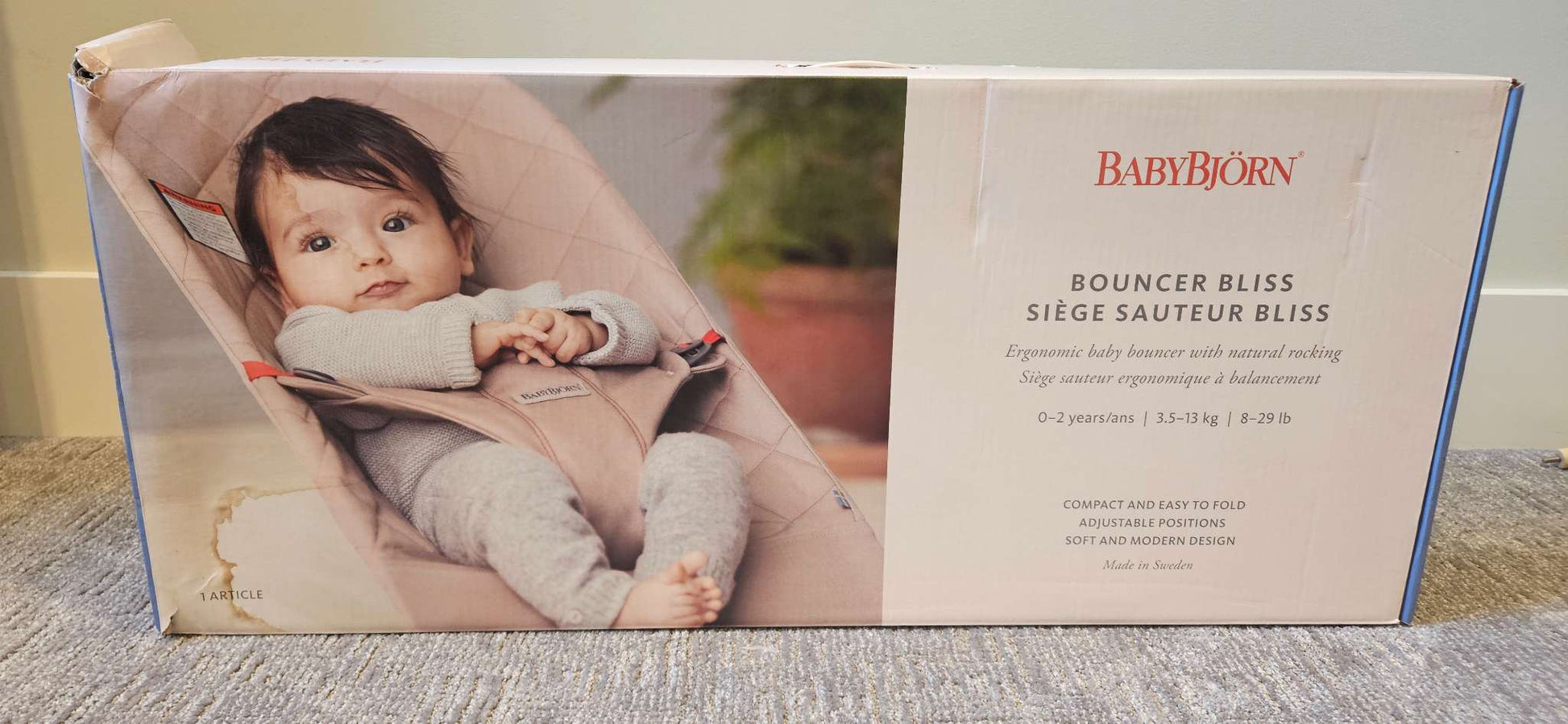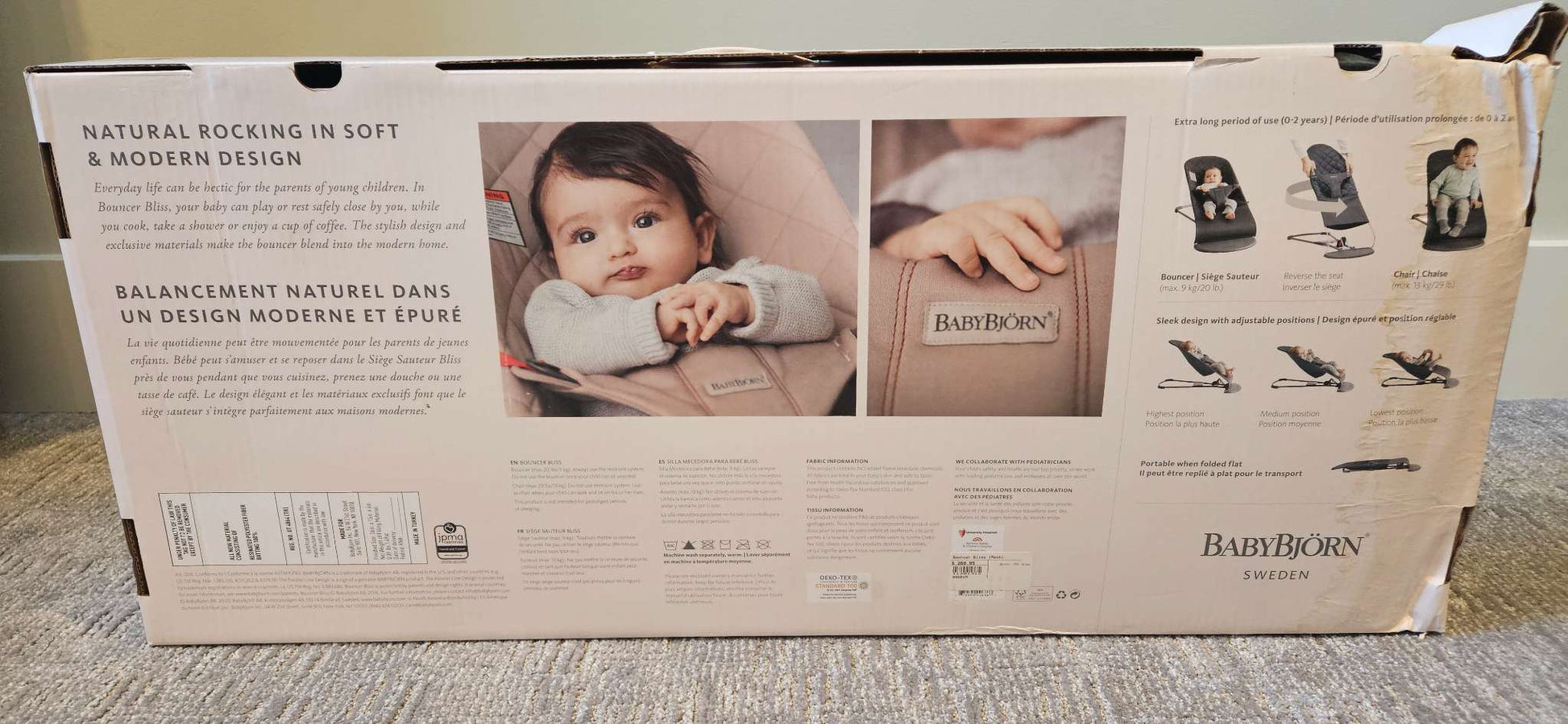 Description : Ergonomic, safe and fun for your baby—our best-selling bouncer comes in mesh, woven and 3D Jersey. Voted "Best Bouncer" in Best For Baby Awards 2024 by Parents Magazine. Ergonomic Natural rocking 3.5–13 kg, from 53 cm 0–2 years See full description here: https://www.babybjorn.ca/products/baby-bouncers/bouncer-bliss/anthracite-mesh-dark-gray/ Only the box has some water damage while it was empty.