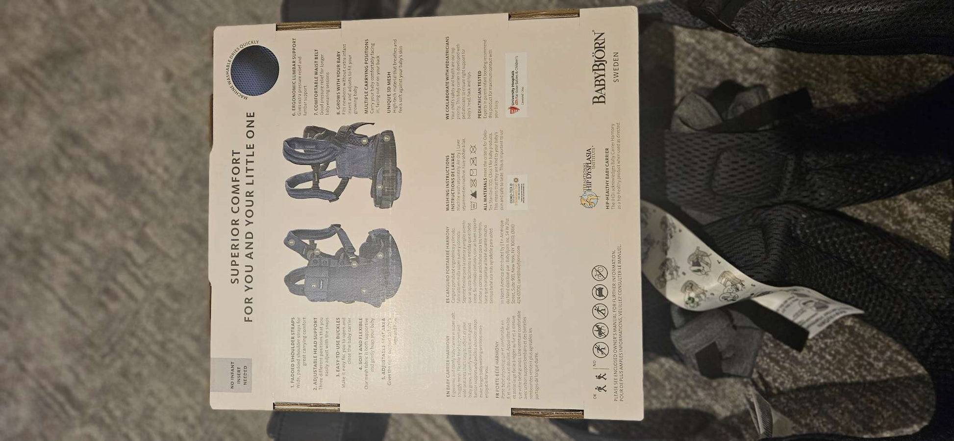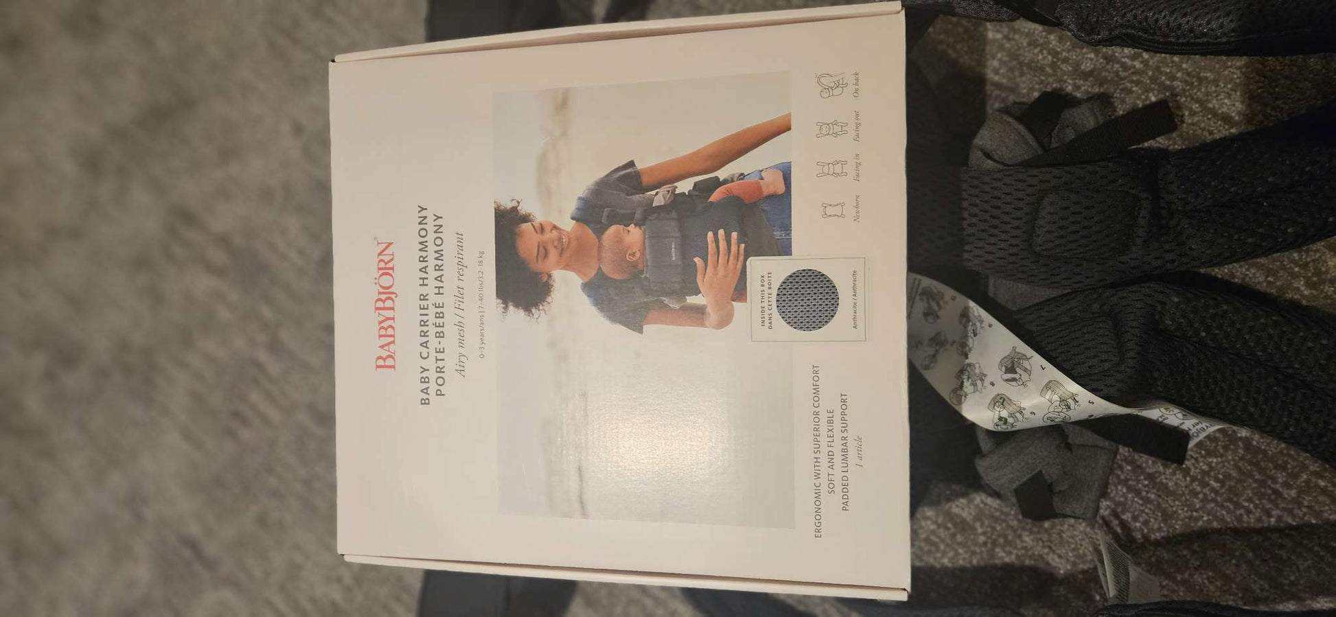 Description : Excellent and basically in new condition. Worn only a handful of times as my baby didn't love being in it. Purchased in 2022 directly from BabyBjorn. 3D Mesh in Anthracite. Super-comfy, super-soft, and super-stylish, as well as ergonomic for you and your baby. 0–3 years 3.2–18 kg, 53–100 cm, 7 - 40 lbs, 21 - 39 in Four carrying positions Acknowledged as hip-healthy by IHDI Adjustable to fit most wearers, from XS to XXL