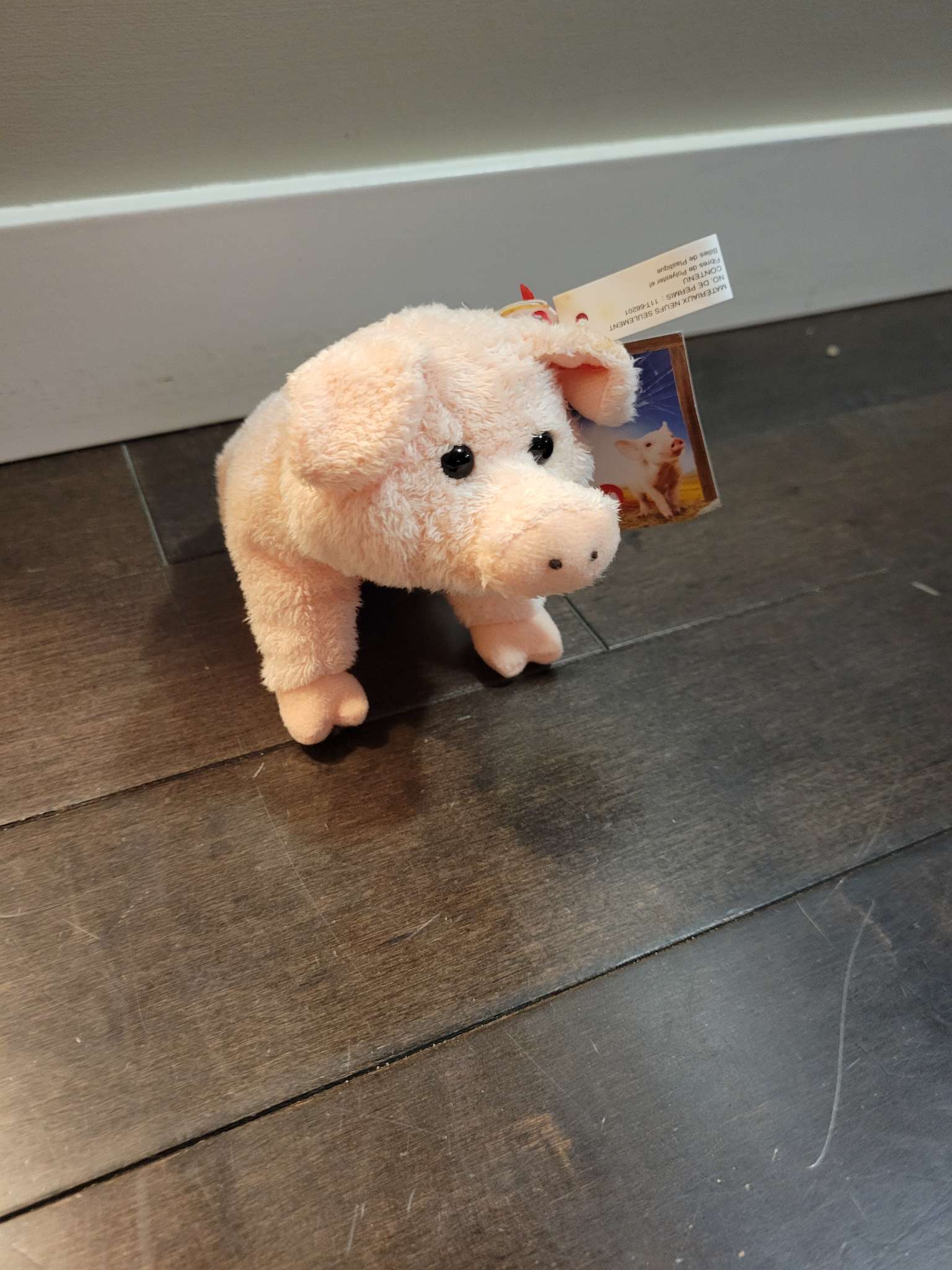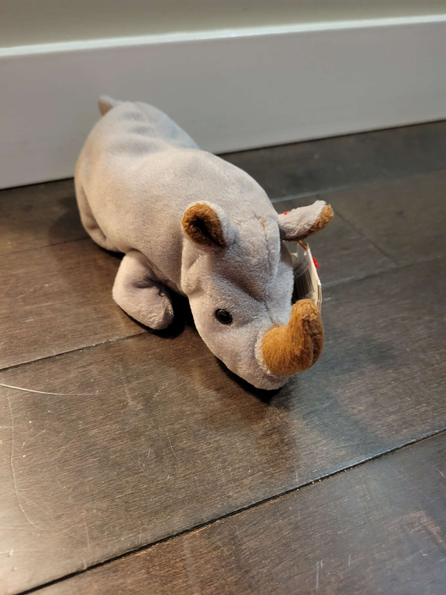 Description : 3 beanie baby stuffies. A rhino, bear and the pig from Charlotte's Web