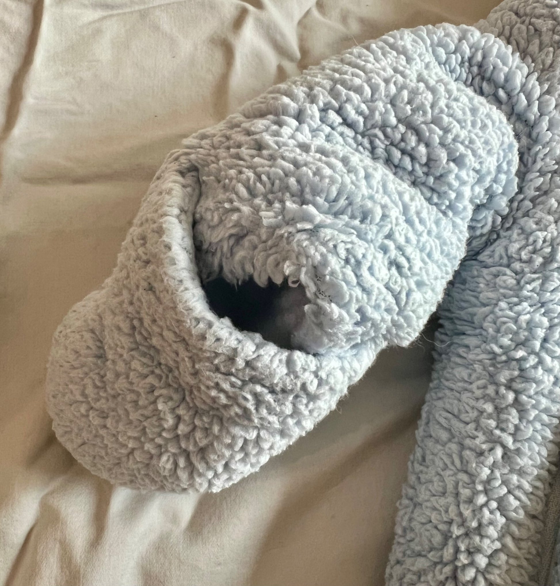 Description : Bébé d’Amour fleece bunting with a puppy dog look. Light blue. Size 0-3 months Zippers go all the way to the feet for ease of dressing. Access to hands. Velcro at the top for a secure fit around the chin. Very thick and warm.