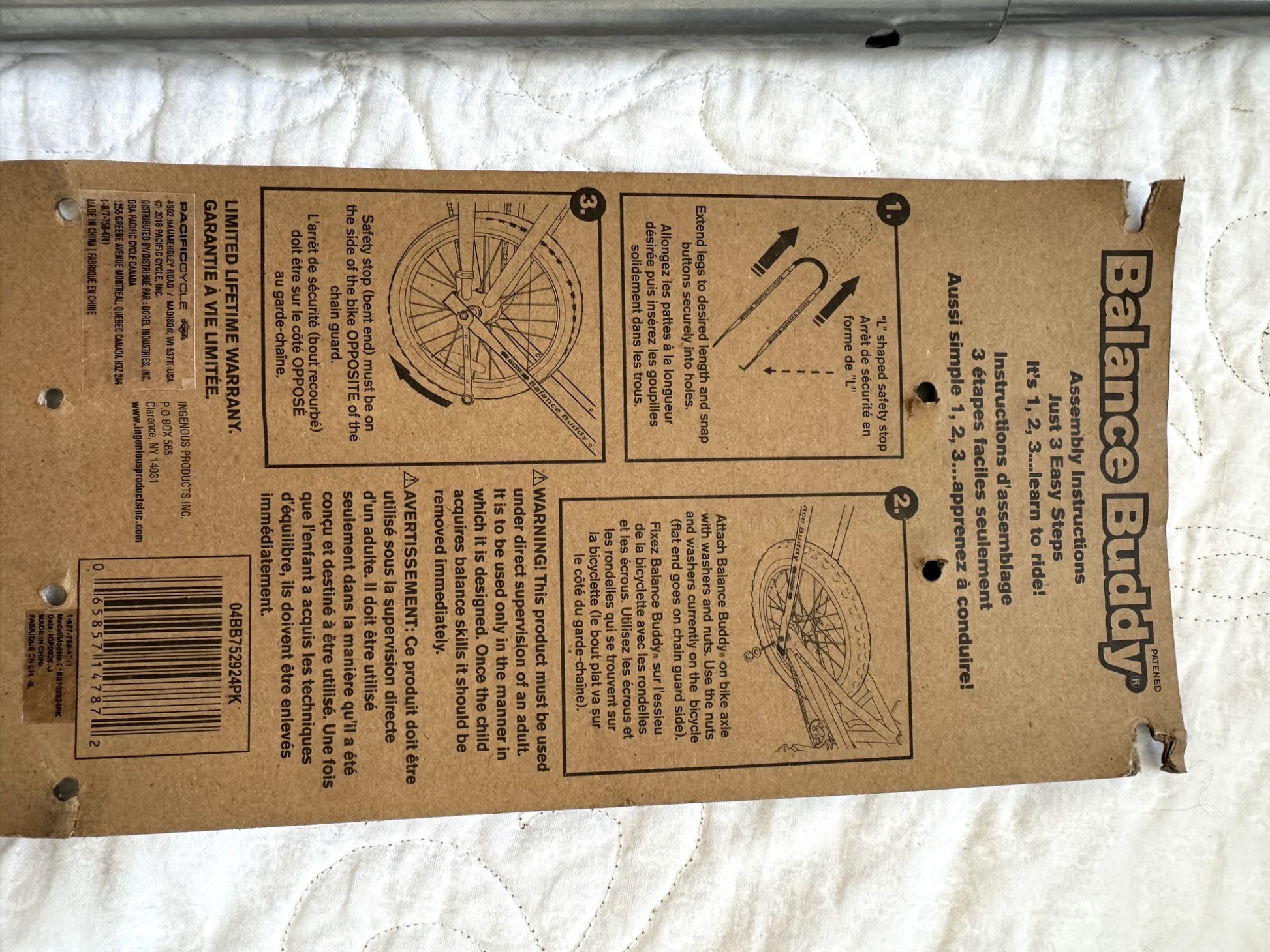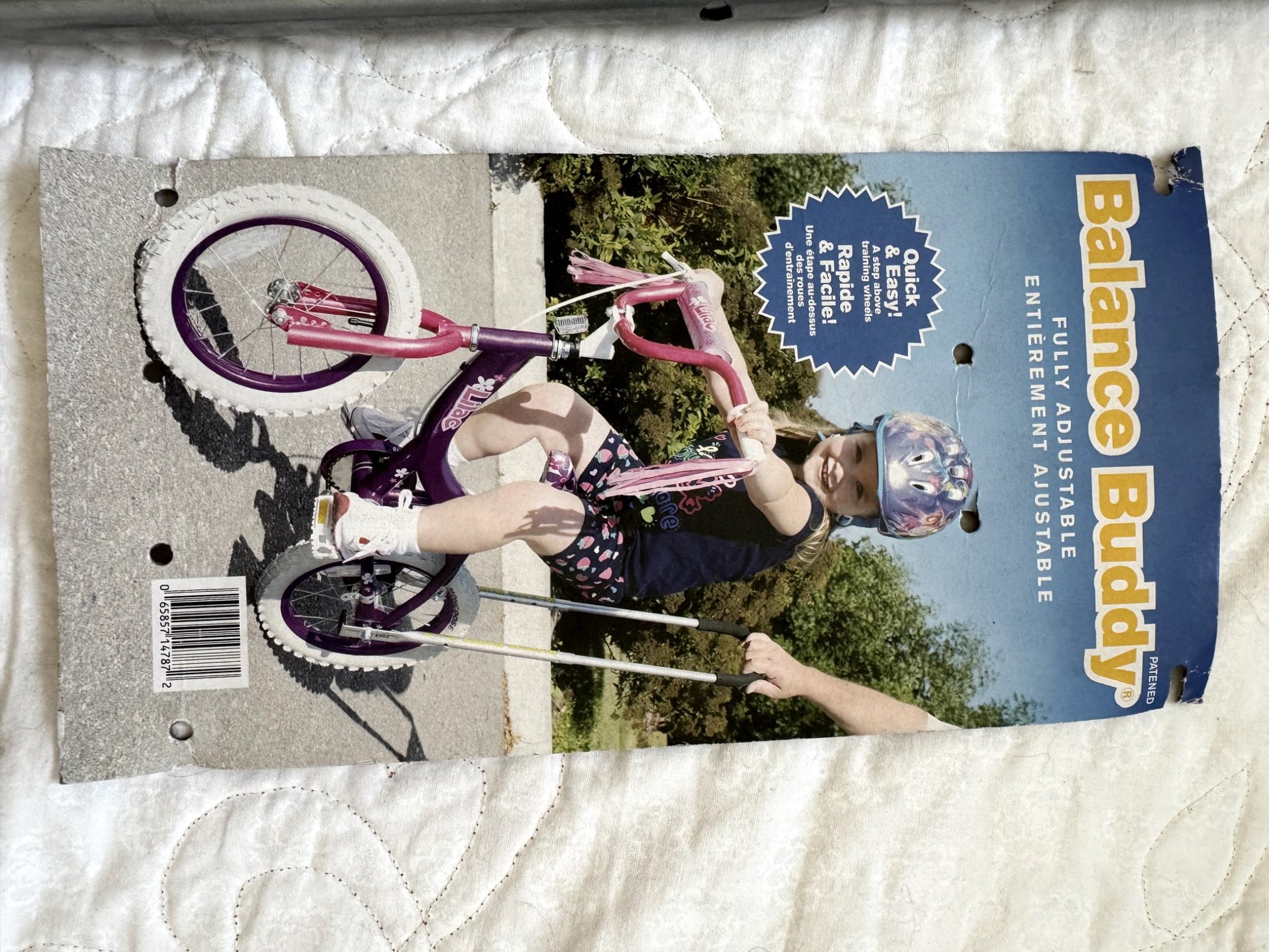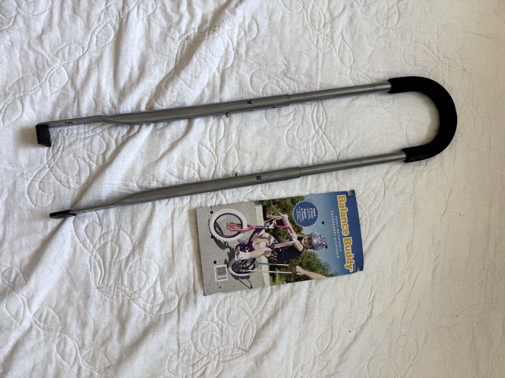 Description : "Balance Buddy" attaches to the back of any kids bicycle for the parent to help with balance. Did not fit on the stridor bike for my toddler. Unused. Comes with the tags but they were cut off to attempt to assemble to the stridor bike. MRSP 29.99